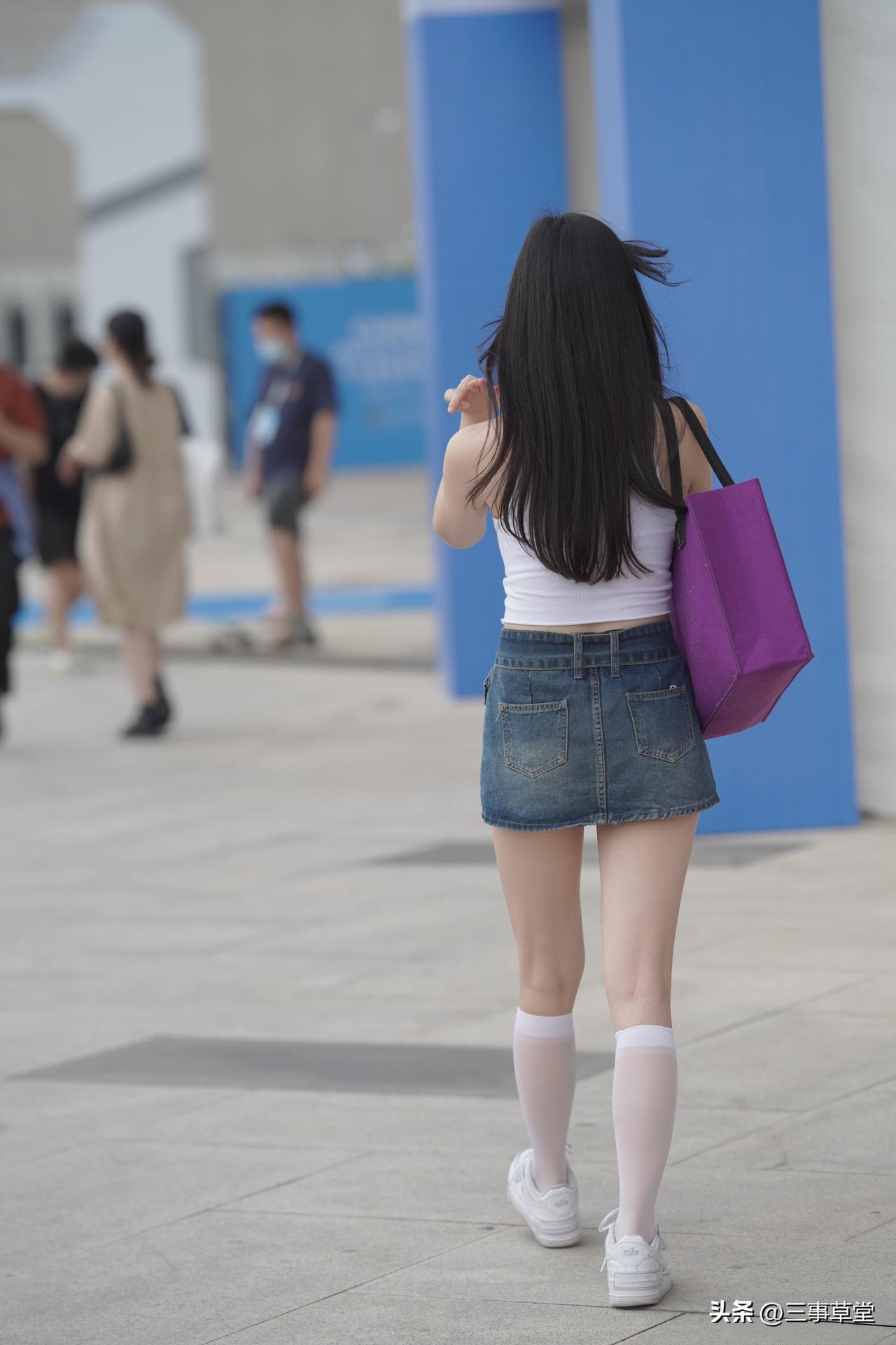 时尚界最佳反差穿搭:牛仔裙裙装配上白色长筒袜,简直是行走的幽默!微胖果然才是最美的!街拍美女好身材