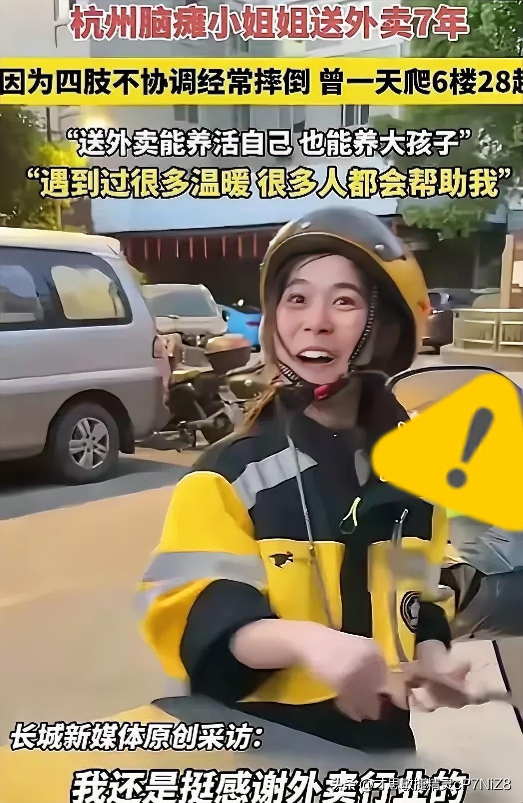 杭州脑瘫女子林晓为送外卖7年,她身体不协调,语言表达不清,顾客常常对她破口大骂,她是同行中得到最多差评的骑手,然而,她从未放弃过。 林晓的先天性脑瘫,是出生时缺氧留下的终身印记。肢体不受控地歪斜,说话含糊打结,这是她从小到大摆脱不掉的标签。 成年后,她不想靠着家人的接济度日,更想给年幼的儿子撑起一片天,便一次次走出家门找工作。超市、保洁公司、小吃店,她跑遍了杭州的大街小巷,所有招聘的地方,几乎都对她关上了门。 一次次被拒的滋味,比身体的僵硬更磨人。她站在招聘摊位前,努力挺直身子,一字一句说自己能干活,可对方看她歪斜的肩膀、颤抖的双手,只摆摆手转身就走。杭州的街头车水马龙,她的脚步却慢得像被黏住,每一次碰壁,都像往心里扎一根针。 最后是外卖骑手的工作,没人挑三拣四,只要能骑上车、能送单,就能挣一份生活费。可对林晓来说,这依旧是道难跨的坎。握车把时,她的手总不受控地往一边歪,电动车晃得像喝了酒;上坡时腿软得发飘,稍不注意就差点栽倒;遇到复杂路况,反应慢半拍的她,常常急得满头大汗。 送外卖的日子更是难上加难。订单地址找不准,她提前半小时打电话确认,哪怕对方不耐烦挂掉,她也一遍遍核对;餐品洒了几滴汤,顾客劈头盖脸一顿骂,她攥着手机站在楼下,低着头连一句辩解都不敢多说。同行里,她的差评数遥遥领先,没人知道这些差评背后,是她拼尽全力的坚持。 7年,2500多个日夜,她就这么骑着一辆旧电动车,穿梭在杭州的街头巷尾。雨天里,她裹着单薄的雨衣,裤脚全被泥水溅湿;深夜收工,她推着没电的车走几公里回家,累得靠在墙角就能睡着。可哪怕再苦再累,她每天都会给儿子打个电话,用含糊的声音说一句“妈妈挣到钱了”。 有人说她“自讨苦吃”,身体这样不如在家歇着。可林晓偏不。她总摸着儿子的头说,妈妈不靠别人,也能让你吃好穿好。这份底气,是她靠一次次被拒绝、一次次咬牙坚持挣来的,比任何施舍都珍贵。 那些曾经骂过她的顾客,后来慢慢有人认出了她。有人看到她歪着身子搬外卖,默默帮她扶一把车;有人收到餐时,会特意说一句“辛苦了,谢谢你”。差评渐渐少了,取而代之的,是越来越多的暖心备注。 身体的残缺从来不是价值的短板。林晓用7年的风雨兼程,告诉所有人:哪怕命运给了她一副烂牌,她也攥紧了拳头,硬生生打出了自己的精彩。她不是弱者,只是在逆境里,活得比谁都倔强、都勇敢。 这份不放弃的韧劲,藏着最动人的人间烟火。我们总说生活不易,可看看林晓,才知道真正的不易,是带着一身缺憾,依然咬牙向前走。她的7年,不是苦难的堆砌,是对生活最赤诚的回应。 各位读者你们怎么看?欢迎在评论区讨论。