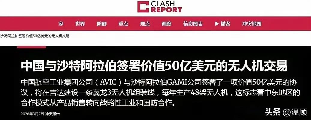 中东局势一紧张,沙特立马看清谁最靠谱。 3月8日,沙特直接和中国签下翼龙‑3无人