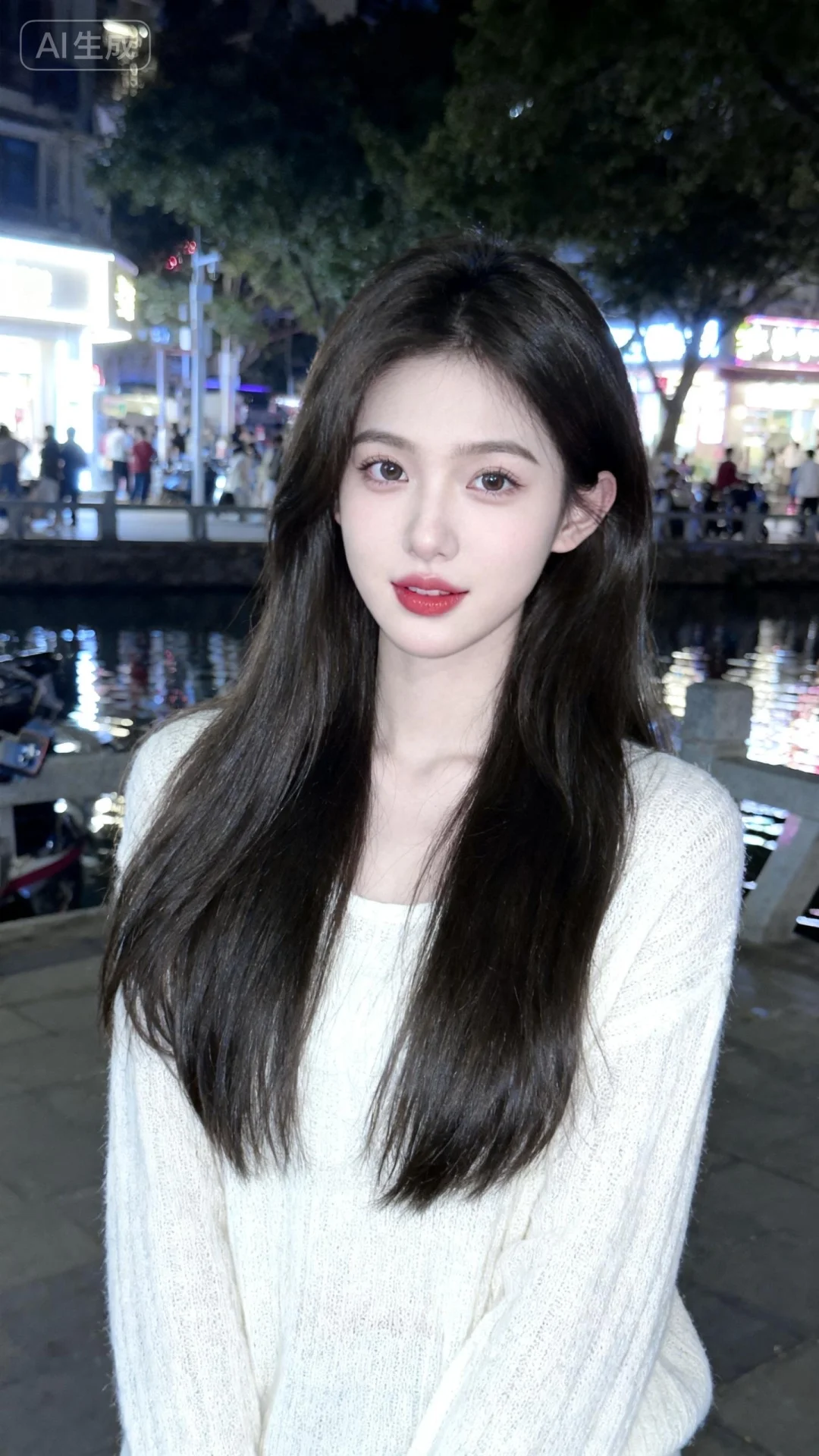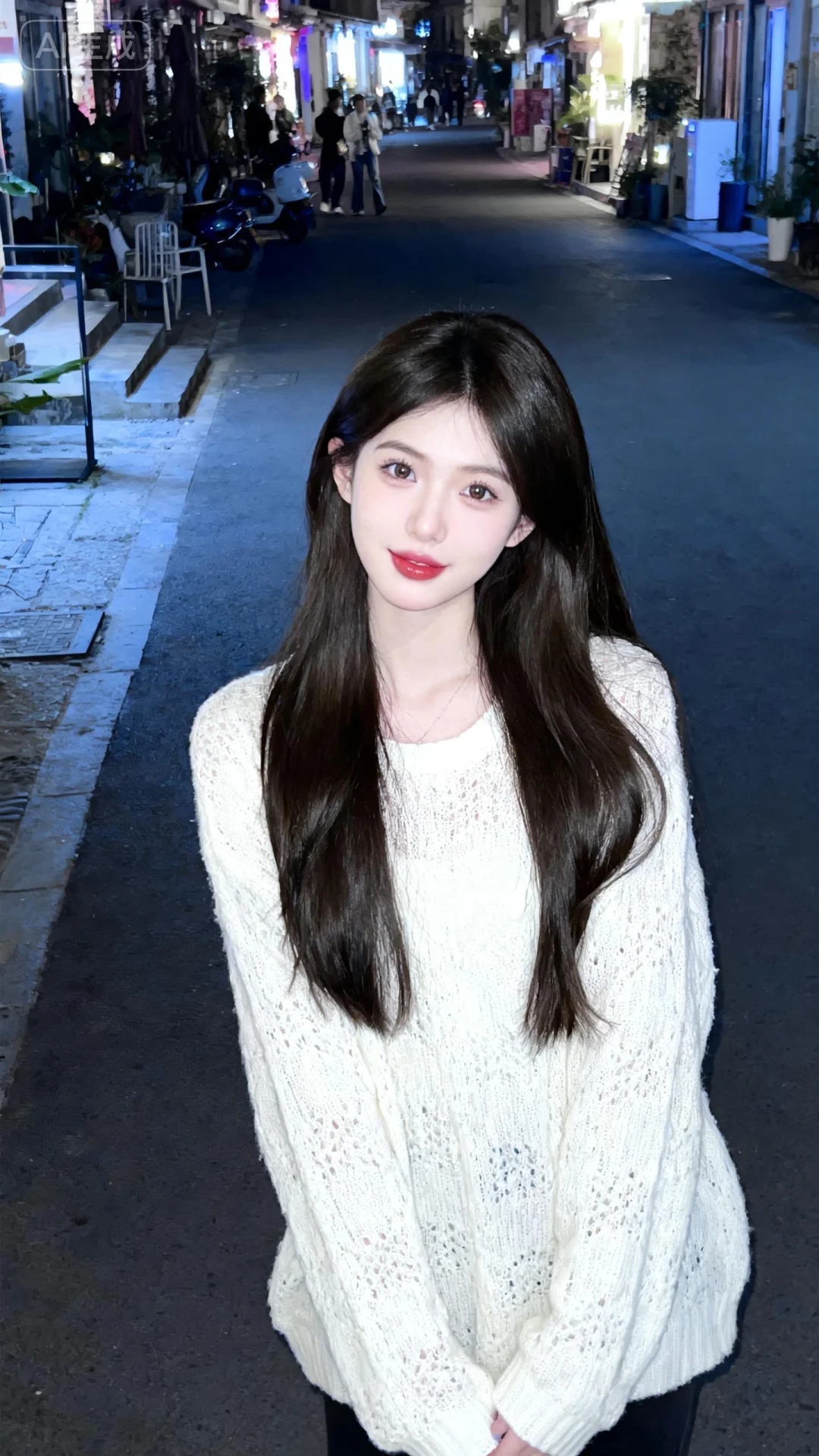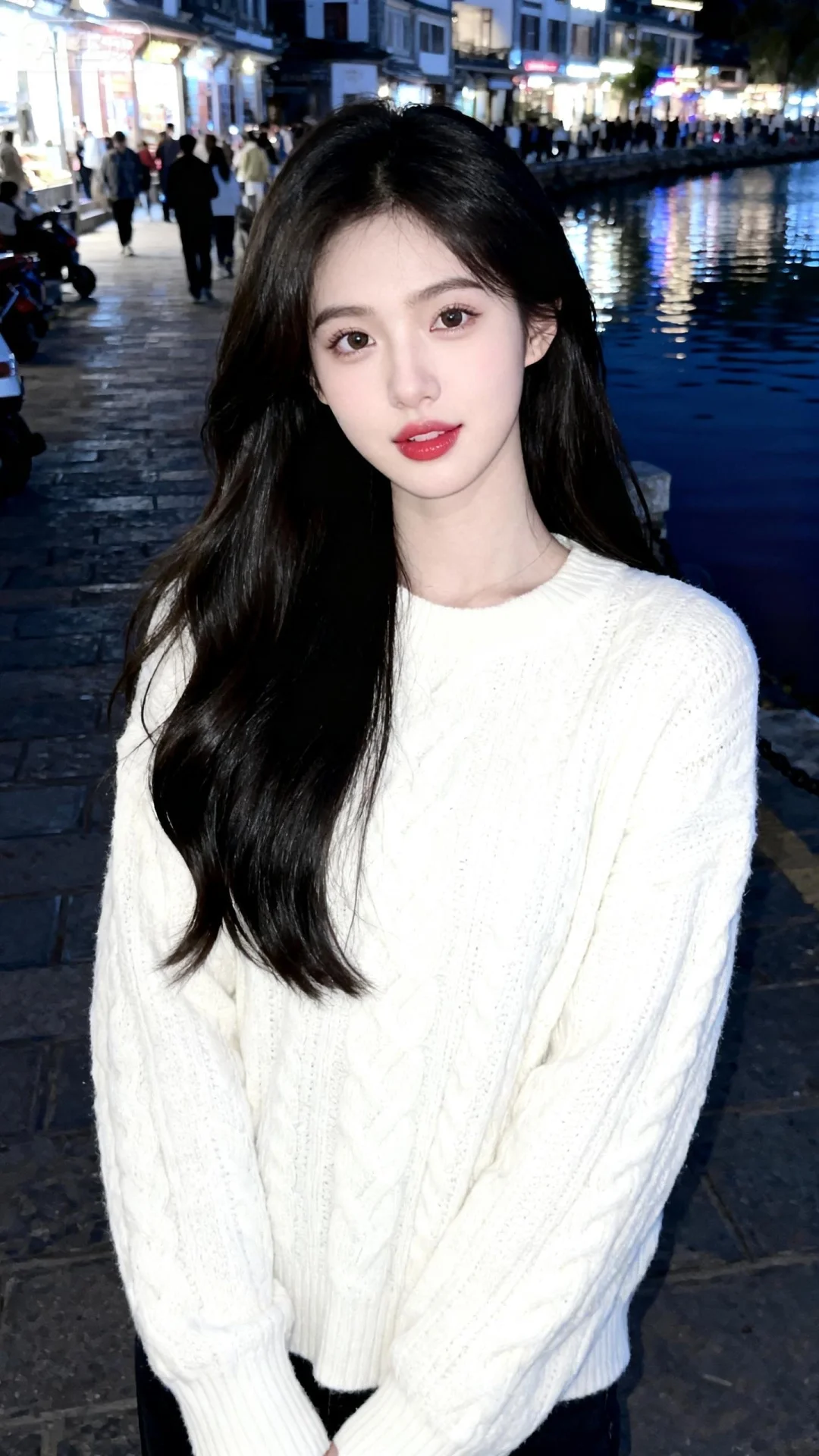 漂亮女生,19岁网红女,冷白皮。穿着白色毛织衫,露出长发,发丝柔顺有光泽,背景是柔和的街边环境,光线均匀明亮,给皮肤镀上一层清透的质感,带着“夜间随拍”的网感,既日常又有氛围感,手机拍摄风格,古早滤镜,摆pose,做可爱表情一位漂亮的亚洲女生,大眼睛双眼皮,大方得体,端庄,自信,绝美容貌,长长的睫毛,微红的嘴唇,柳眉纤细,眼眸深情深邃,悬胆鼻,樱桃唇,女子五官、妆容精致,皮肤白皙,年轻貌美,完美身材,比例协调,神情温柔羞怯,每一处细节都仿佛是经过时光雕琢的艺术品。她的表情平静,如同静谧的湖水,超高清细节,整体光线亮白,真人真实写真风格,真实场景。超清晰摄影大师用光。超广角镜头,远景,全身照,有氛围感,超精细,细节丰富,色彩丰富多彩,超高清画质32k,摄影作品。