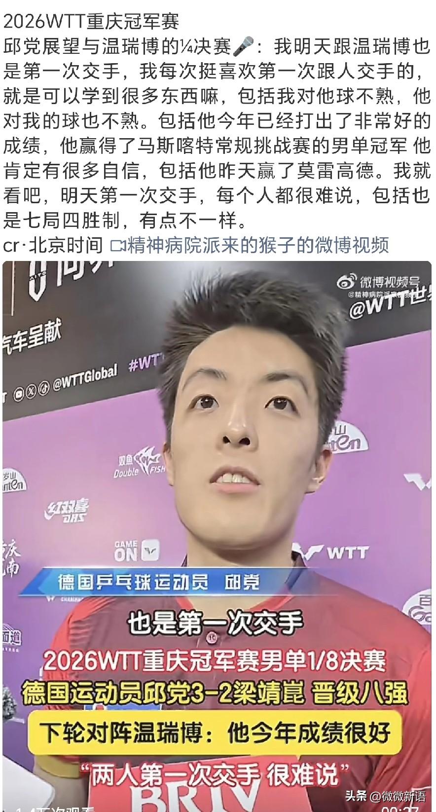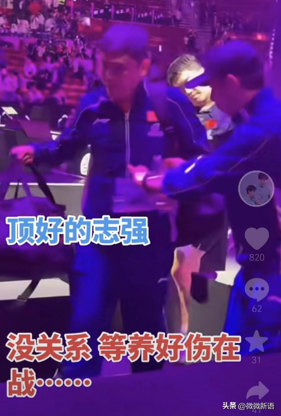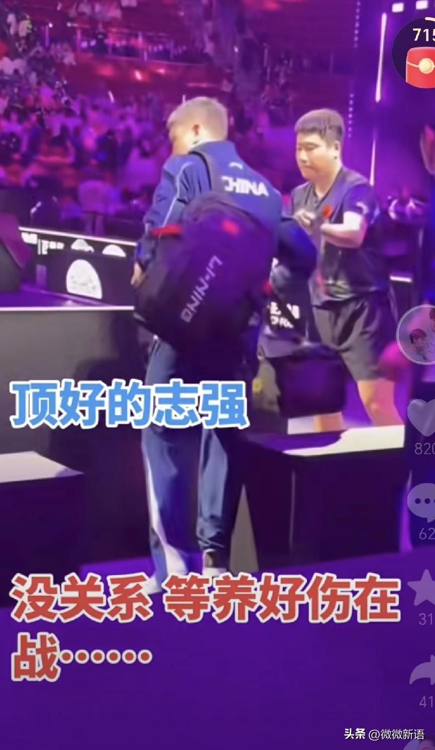 志强肯定也很心疼梁靖崑吧。 今天梁靖崑在赛前训练时又把腿拉伤了,经过简单的处理后他还是决定打完今天的比赛,候场的时候他用衣服盖着腿,站起来活动的时候看到他就是忍着疼,看着他真的会觉得运动员太不容易,他肯定也想把今天的比赛赢下来,下一轮对阵温瑞博,估计就退赛了,但是今天前两局的状态好,大比分2-0领先的情况下,被邱党逆转了,但是他真的尽力了。赛后看到志强赶紧帮甜甜拎包,队医过来帮志强拿水,确实这半年多的时间里,梁靖崑一直被伤病困扰,好不容易恢复的差不多参加比赛,训练的时候又给伤了,希望好好养伤,接下来的世界杯加油。 这次重庆冠军赛国乒男队是王楚钦、温瑞博晋级8强,上一轮比赛温瑞博是赢了莫雷加德,明天的男单1/4决赛邱党将对阵温瑞博,看了邱党刚刚的采访,他说这是俩人第一次交手,也说不好,我对他的球不熟,他对我的球也不熟,而且近期温瑞博打的也不错,这次也是赢了莫雷加德,所以也很难说,而且明天开始是七局四胜制,也有点不一样。这次比赛温瑞博的场外的刘恒,俩人配合的还是不错的,明天小温加油,全力以赴去拼邱党。