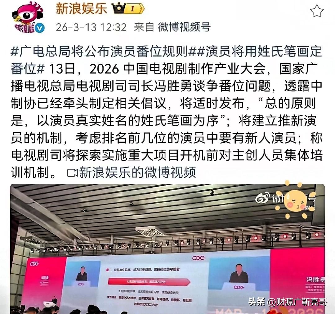 内娱这种“谁站C位”的烂戏,总算踢到钢板了。 广电这回不再是温水煮青蛙,直接在电视剧制作大会上祭出了杀招:演员排名,往后一律按“姓氏笔画”排。 管你是什么顶流大咖,还是背后有资本撑腰的宠儿,在笔画多寡面前通通平等。以前那些为了个名字先后顺序,闹到法庭见、甚至逼得剧组停工的荒唐事,以后怕是彻底没戏了。这就是在拆解那些虚伪的“咖位”滤镜,让大家看清楚,戏是演给观众看的,不是演给排序表看的。 这种强制性的公平,其实是给那些真正想拍好戏的创作者解绑。不用再花大半精力去协调谁心理不平衡,谁家粉丝又不满意。 行业回归常识,往往都需要这种带点“蛮力”的干预。那些只会靠撕番位立人设的,这回是真的要现原形了。没了这些无谓的内耗,东方大国电视剧要是再拍不出像样的东西,那可就真找不到借口了。 你们怎么认为?