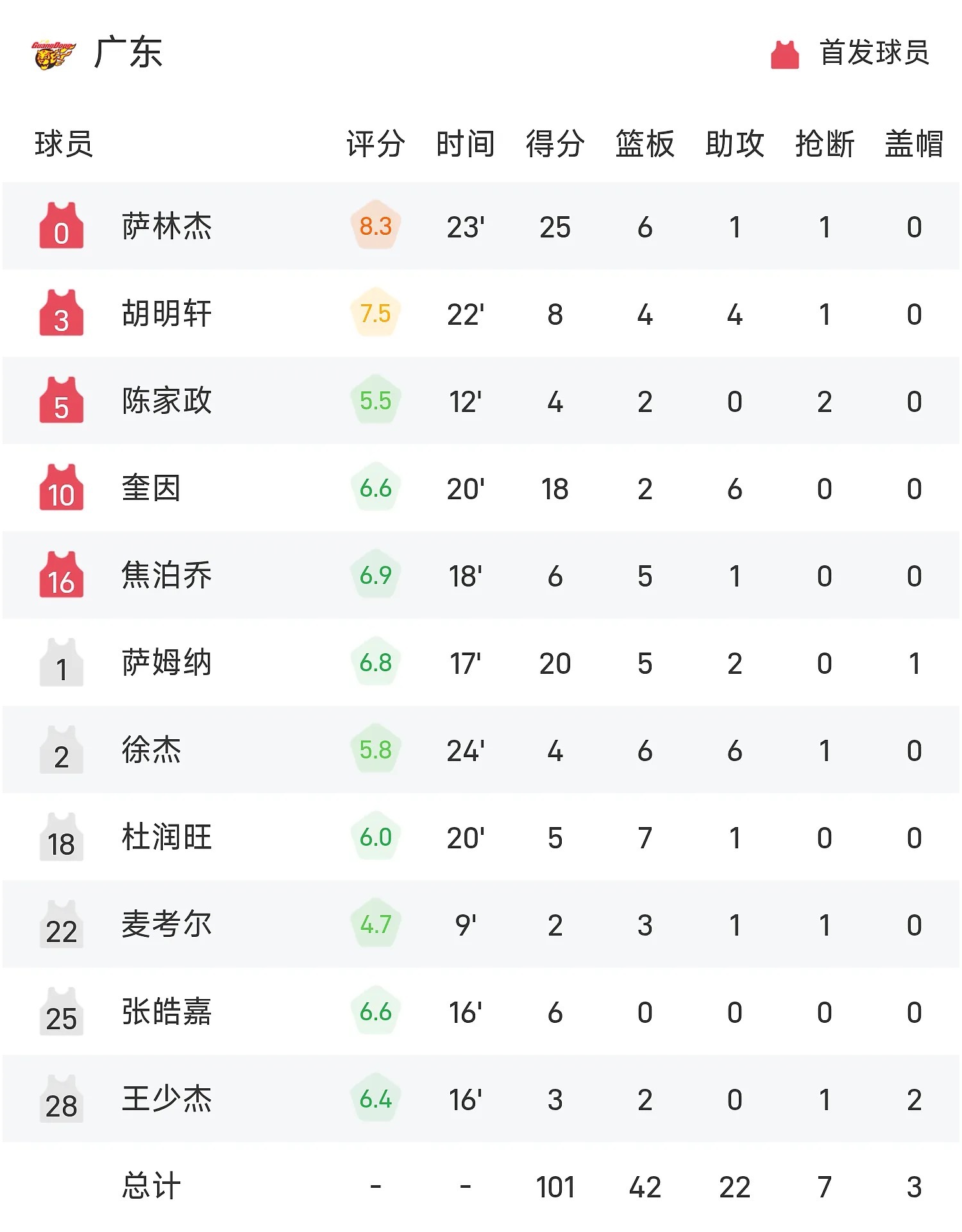 而广东男篮则依靠外援萨林杰的内线统治力稳住局面,他全场砍下25分6篮板1助攻,用强硬的低位单打和稳定的中距离投篮撑起球队进攻,成为全场得分最高的球员。本土球员也在关键时刻站了出来:张皓嘉末节两记三分球续命,徐杰最后时刻的抛投与关键篮板锁定胜局,奎因也贡献18分2篮板6助攻的全面数据,用团队执行力顶住了深圳的疯狂反扑。