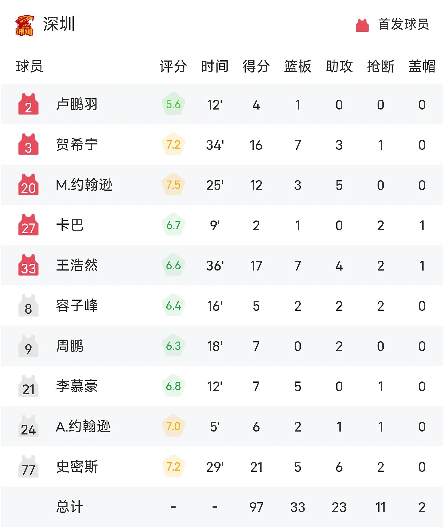 深圳男篮虽主场惜败,但表现同样可圈可点:史密斯砍下21分6篮板6助攻,贺希宁16分7篮板3助攻,王浩然17分7篮板4助攻,三人得分上双的表现展现了球队的深度,只是在最后时刻的关键球处理上稍逊一筹,遗憾未能完成逆转。