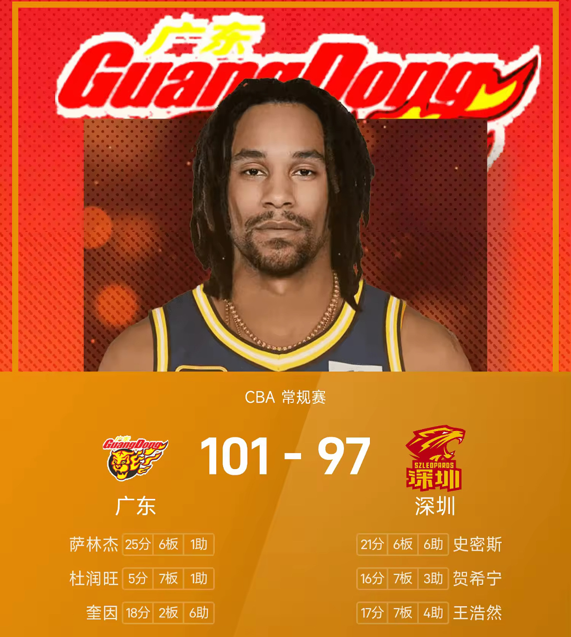 广东德比4分险胜!萨林杰25分统治内线,广东101-97力克深圳守住连胜广东男篮深圳男篮广东德比CBA战报萨林杰徐杰