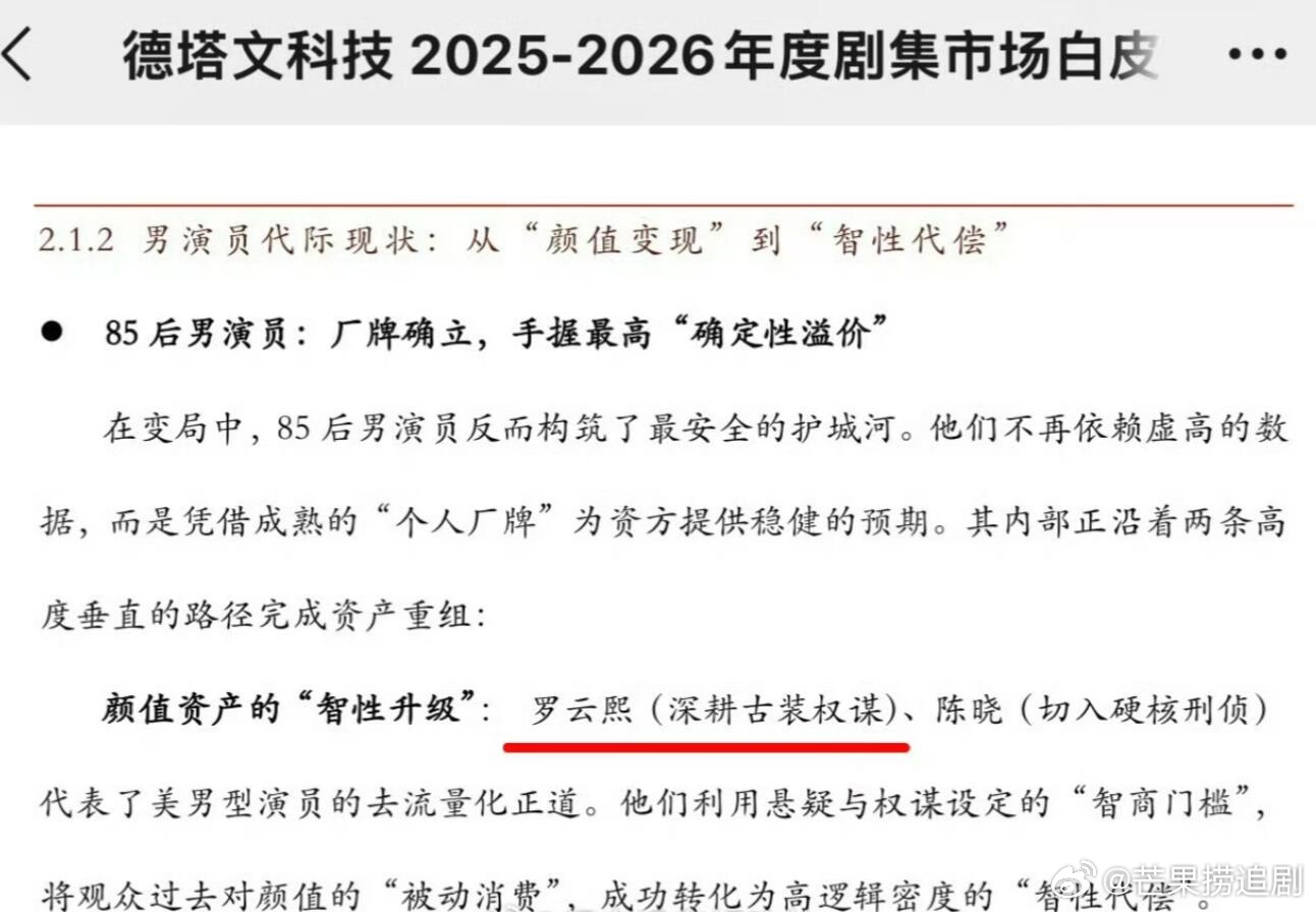 被业内深度认可,德塔文2025-2026剧集市场白皮书提到85后男演员代际现状,凭借成熟的“个人厂牌”为资方提供了稳定的预期,举例了美男型演员罗云熙(深耕古装权谋),从颜值被动消费转化为“智性代偿”,罗云熙个人IP型标签又加深印象了