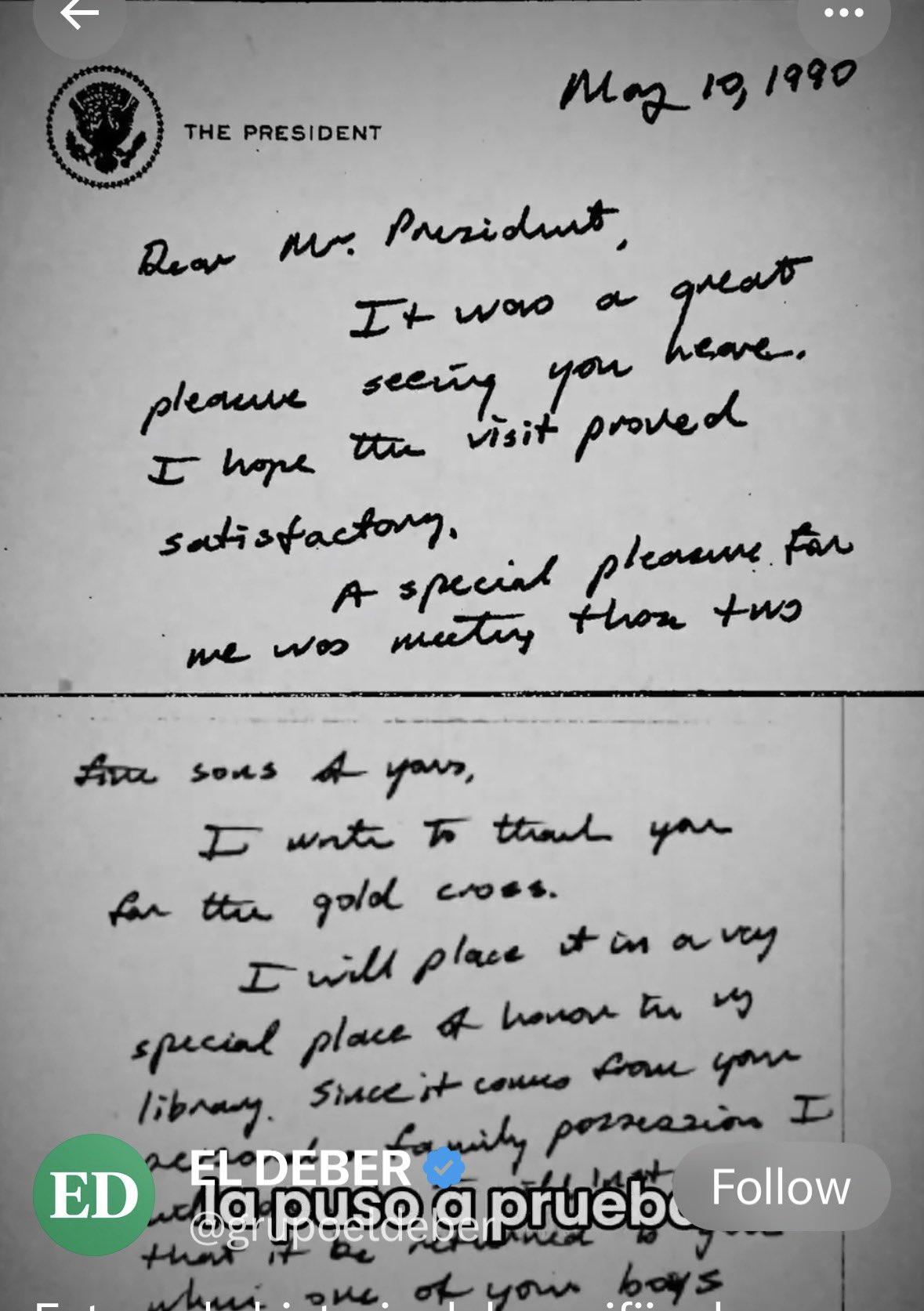 1990年,白宫。 时任玻利维亚总统帕斯,送给老布什总统一枚家族金十字架。 老布什收下了,但他提出个条件 —— 如果帕斯的儿子有一天当上玻利维亚总统,这枚十字架就会归还。 这承诺写在一张手写的便条上,存入白宫档案。 听起来像不像一句客套话? 一个几乎不可能实现的口头支票。 36年过去了, 世界的变化早已天翻地覆。 而2025年,帕斯的儿子,罗德里戈·帕斯,真的当选了玻利维亚总统。 布什总统图书馆立刻联系了美国国务院。 昨天,在多拉尔峰会上,国务卿卢比奥亲手将十字架还给了新总统帕斯。 还附上了那张36年前的便条复印件。 最动人的是什么? 新总统帕斯,把这个故事讲给了他86岁的老父亲听。