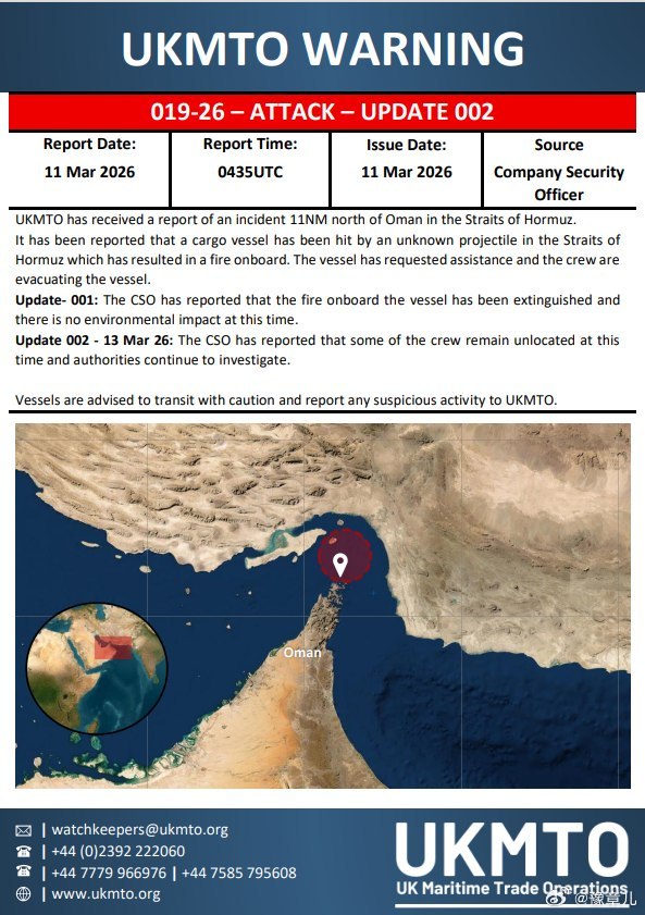 英国海事贸易中心:一艘船只在霍尔木兹海峡附近遭到袭击并起火。