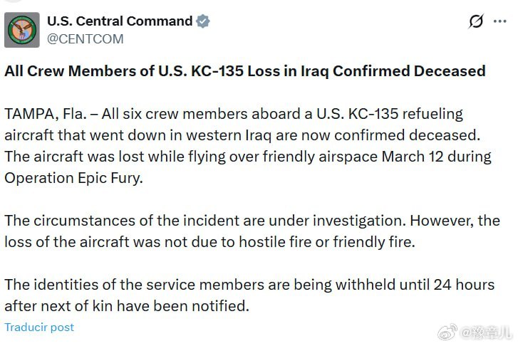 美国中央司令部确认,昨晚在伊拉克西部被击落的KC-135加油机的六名机组人员全部“狗带”。