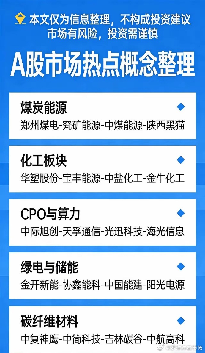 A股热点概念整理!5大核心赛道龙头股清单 AI+能源+新材料风口不断,整理了当前市场最火的5大概念板块,龙头股一次性打包给你👇 1️⃣ 煤炭能源 郑州煤电、兖矿能源、中煤能源、陕西黑猫 (传统能源稳盘,供需格局偏紧) 2️⃣ 化工板块 华塑股份、宝丰能源、中盐化工、金牛化工 (周期复苏+成本优势凸显) 3️⃣ CPO与算力 中际旭创、天孚通信、光迅科技、海光信息 (AI算力核心硬件,高景气持续) 4️⃣ 绿电与储能 金开新能、协鑫能科、中国能建、阳光电源 (算电协同+新能源转型双主线) 5️⃣ 碳纤维材料 中复神鹰、中简科技、吉林碳谷、中航高科 (军工+新能源双驱动,国产替代加速) 💡 市场轮动快,抓主线更要盯核心标的! ⚠️ 本文仅为信息整理,不构成投资建议,市场有风险,投资需谨慎!