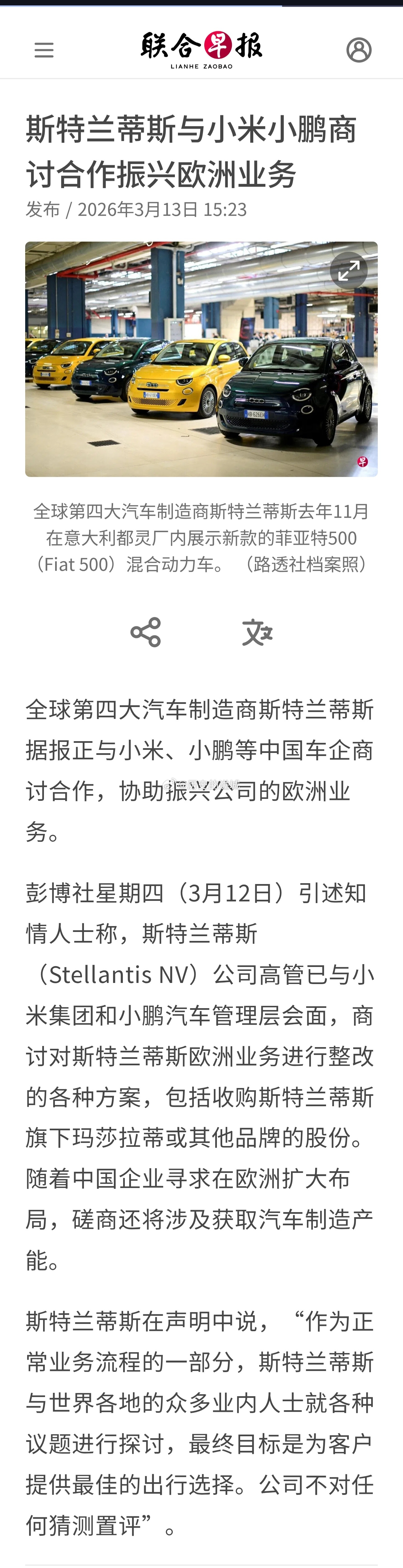全球第四大汽车制造商斯特兰蒂斯据报正与小米、小鹏等中国车企商讨合作,协助振兴公司的欧洲业务。彭博社星期四(3月12日)引述知情人士称,斯特兰蒂斯公司高管已与小米集团和小鹏汽车管理层会面,商讨对斯特兰蒂斯欧洲业务进行整改的各种方案,包括收购斯特兰蒂斯旗下玛莎拉蒂或其他品牌的股份。随着中国企业寻求在欧洲扩大布局,磋商还将涉及获取汽车制造产能。