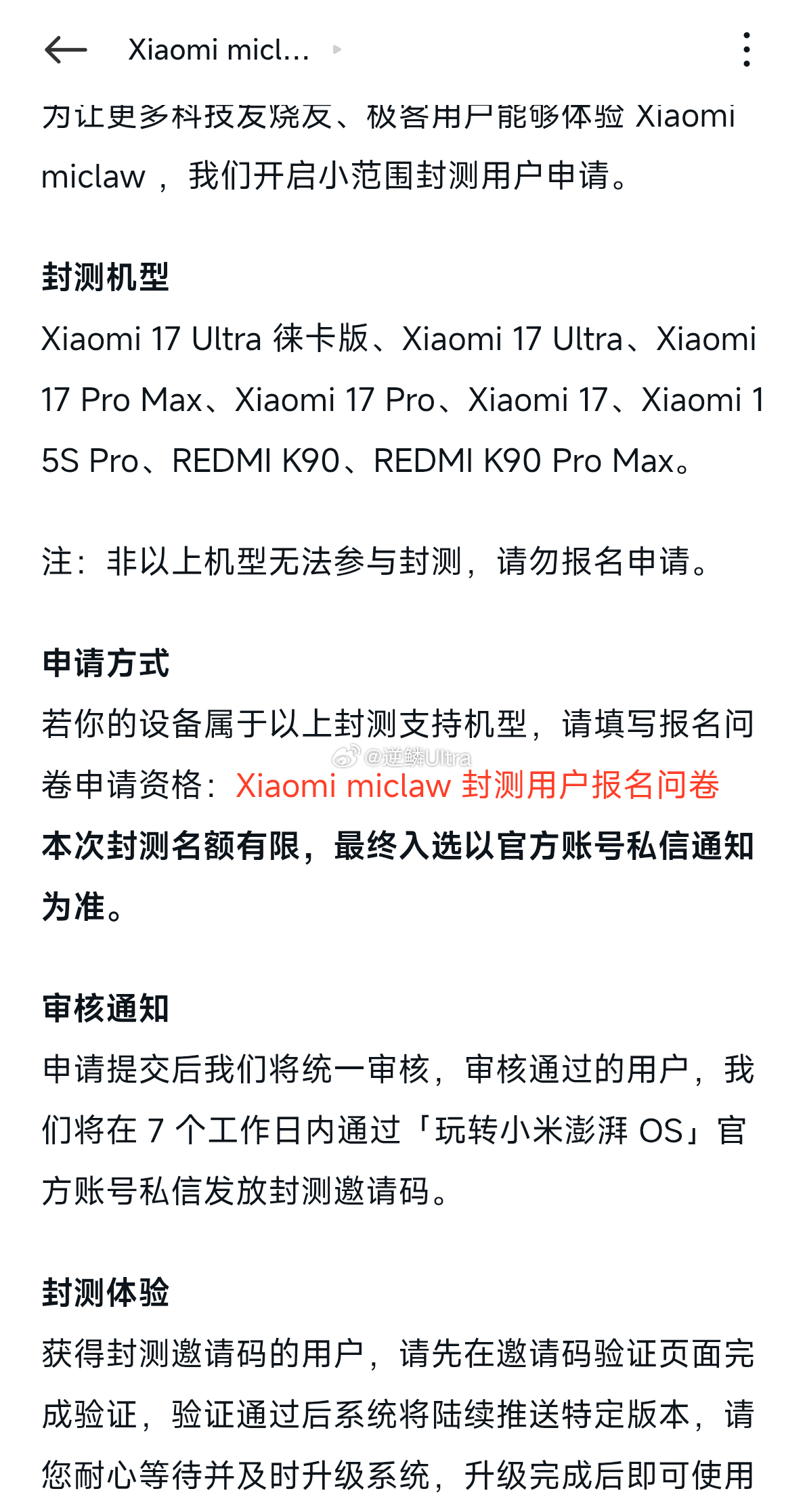 小米17系列/K90系列/小米15SPro在用以上机型用户的朋友快去申请吧 网页链接