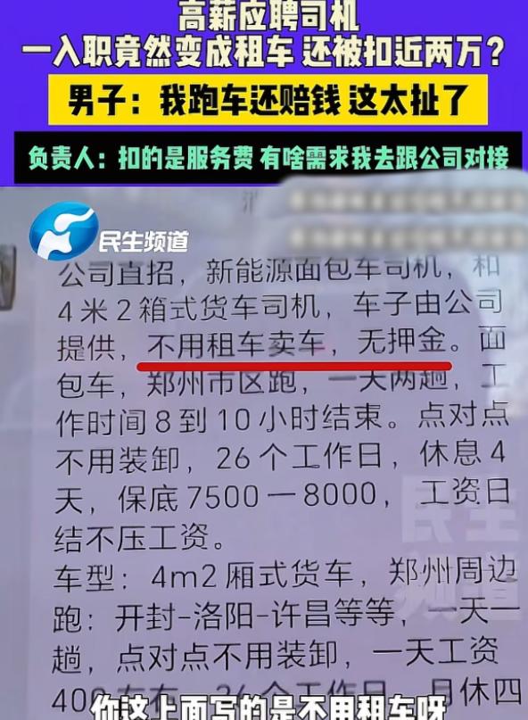河南郑州,男子去应聘司机,对方说每天最低400元工资,可男子一入职,就被扣了近2万元,对方说提前扣除装卸费,车子你开走,不给工资了,给你派活,你就收运费,车子所有权还是公司的,男子傻眼了:我跑车,我还赔钱,太扯了,他质疑自己应聘变成了租车,可公司负责人却说:你租车了吗?你签的是使用合同,男子要求对方退回费用,可对方的回答,却让他欲哭无泪。 这名男子因生活需要寻找稳定工作,在网络平台看到一则司机招聘信息,对方明确承诺每日薪资不低于四百元,工作内容简单,收入稳定。 对于急需就业的他来说十分有吸引力,看到招聘条件宽松、薪资待遇优厚,男子没有过多犹豫,便按照地址前往公司参加面试,面试过程十分顺利,工作人员并未提出过高要求,也没有提及任何额外费用,只是让他尽快办理入职手续,尽快上岗赚钱。 男子以为遇到了靠谱工作,满心欢喜配合公司流程,却不知已经踏入精心设计的圈套,入职当天,工作人员以办理入职、登记信息、开通服务等名义,让男子签署多份文件,全程快速催促,并未详细解释条款内容,也未提醒任何风险。 随后工作人员以操作入职系统为由,拿过男子的手机进行操作,完成绑定与认证步骤,男子出于信任全程配合,并未察觉异常,直到扣款信息发送到手机,他才发现账户被一次性扣除近两万元,这笔突如其来的费用让他瞬间慌神,连忙向公司询问缘由。 面对质疑,公司工作人员一改此前态度,给出的解释彻底颠覆男子认知,对方声称这笔钱是提前扣除的装卸服务费用,从入职起双方不再是雇佣关系,公司不会再发放固定工资,只会为其派发运输订单,收入依靠订单运费自行结算,提供的车辆所有权仍归公司所有,男子仅有使用权。 男子这才明白,自己从应聘司机变成了无偿为公司跑车的运营者,不仅没有底薪保障,还要承担车辆使用与运输过程中的各类成本,实际收入扣除各项开支后所剩无几,甚至出现跑车赔钱的情况,与此前承诺的稳定高薪完全不符。 他意识到自己遭遇骗局,当即提出这是变相租车,要求终止合作并退还被扣费用,公司负责人面对男子的合理诉求,拒不承认存在欺诈行为,反而以合同为挡箭牌,坚称男子签署的是车辆使用合同,并非租赁合同,所有条款均已注明,费用扣除符合约定,拒绝退还钱款。 男子试图与对方理论,却被对方以合同条款反复搪塞,当初签署文件时被刻意隐瞒的内容,如今成为公司拒绝退费的理由,他试图维权,却因合同文字游戏陷入被动,既无法认定为劳动纠纷,也难以直接判定为诈骗,维权渠道受阻。 面对公司的强硬态度与冰冷说辞,这名求职不成反遭扣款的男子陷入绝望,心中满是委屈与无奈,却不知该如何挽回损失。 此类以高薪为诱饵,将招聘变相转为租赁或服务收费的陷阱,在求职市场时有发生,利用求职者急于就业的心理,隐瞒关键信息,诱导签署不利合同,再以合同为由逃避责任,让许多普通人蒙受经济损失。 此次郑州男子的遭遇,再次提醒广大求职者,面对高薪招聘务必保持警惕,仔细核对合同条款,不轻易授权手机操作、不随意签署不明文件,遇到入职先收费的情况及时远离,避免落入求职圈套,保护自身财产与合法权益不受侵害。