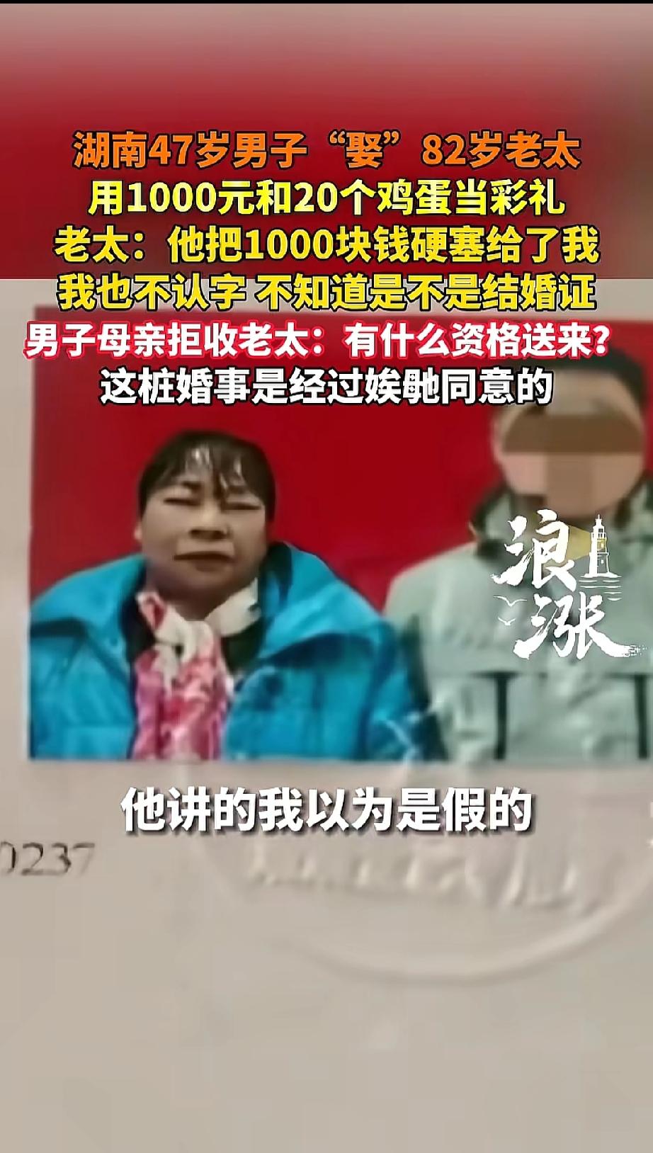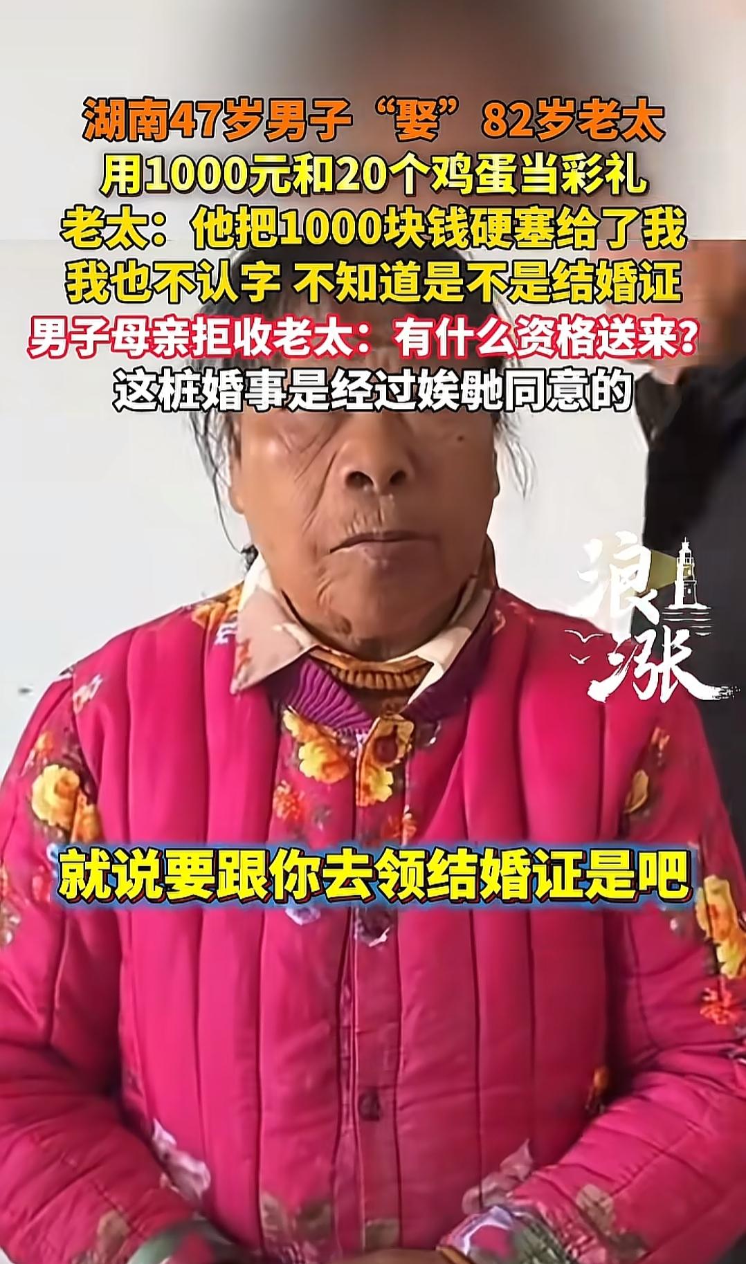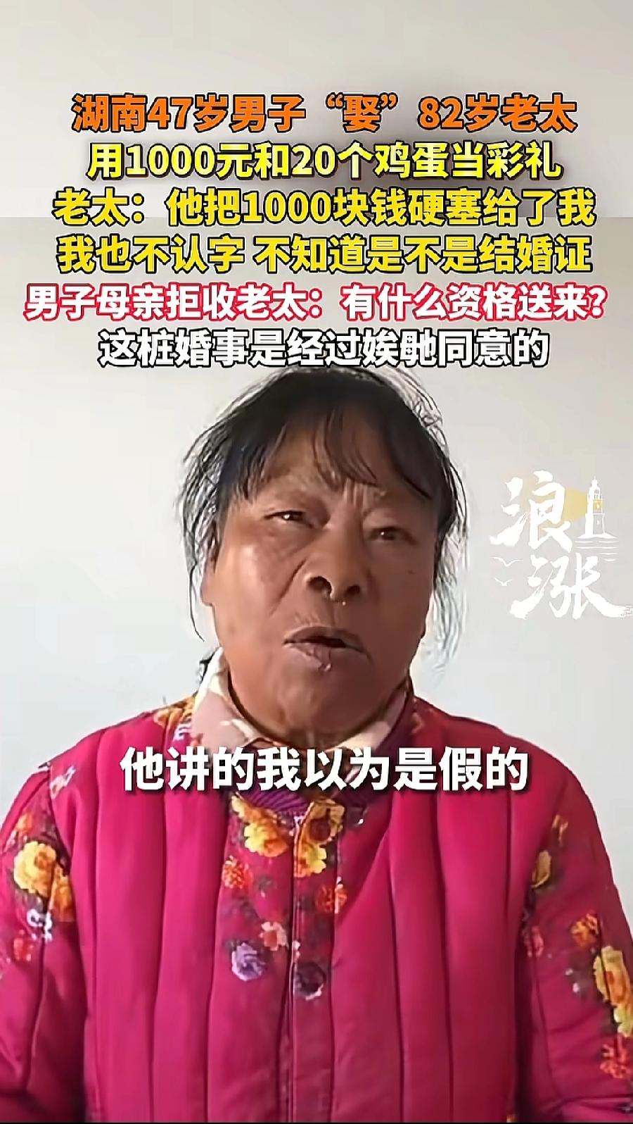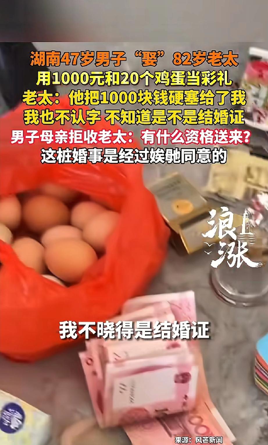 太炸裂了!湖南一位47岁的男子迎娶82岁老太当新娘。 他仅用1000块钱和20个鸡蛋作为彩礼,硬是把1000块钱塞给了82岁的老太,称要和她领结婚证。而老太不识字,也不知这结婚证是真是假,还以为是假的,没想到真就去领了证。 看见没有,女人无论年纪多大都有人要,而且无论多大都得给彩礼,哪怕是82岁也不例外。不得不说,这位82岁的老太太头发这么黑,保养得看着还挺年轻。这世界真是越来越魔幻了,变得让我越来越看不懂了。 高实在是高。
