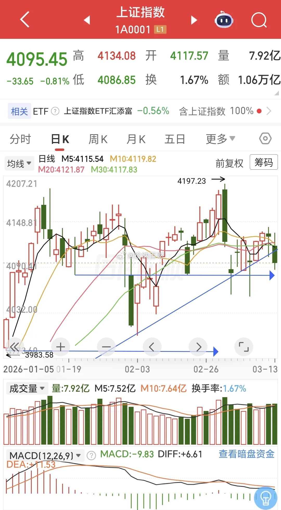 回到盘面,下午刚开盘走的还挺好,指数在证券股的带动下很快翻红,但是又很快被砸了回来;再加上石油,煤炭,电力,有色金属,科技,等板块的掩杀之下,大盘失去了还手之力,最低杀到4086点,收于4095,被摁在了上升趋势线的下面,走势一下子难看了起来。