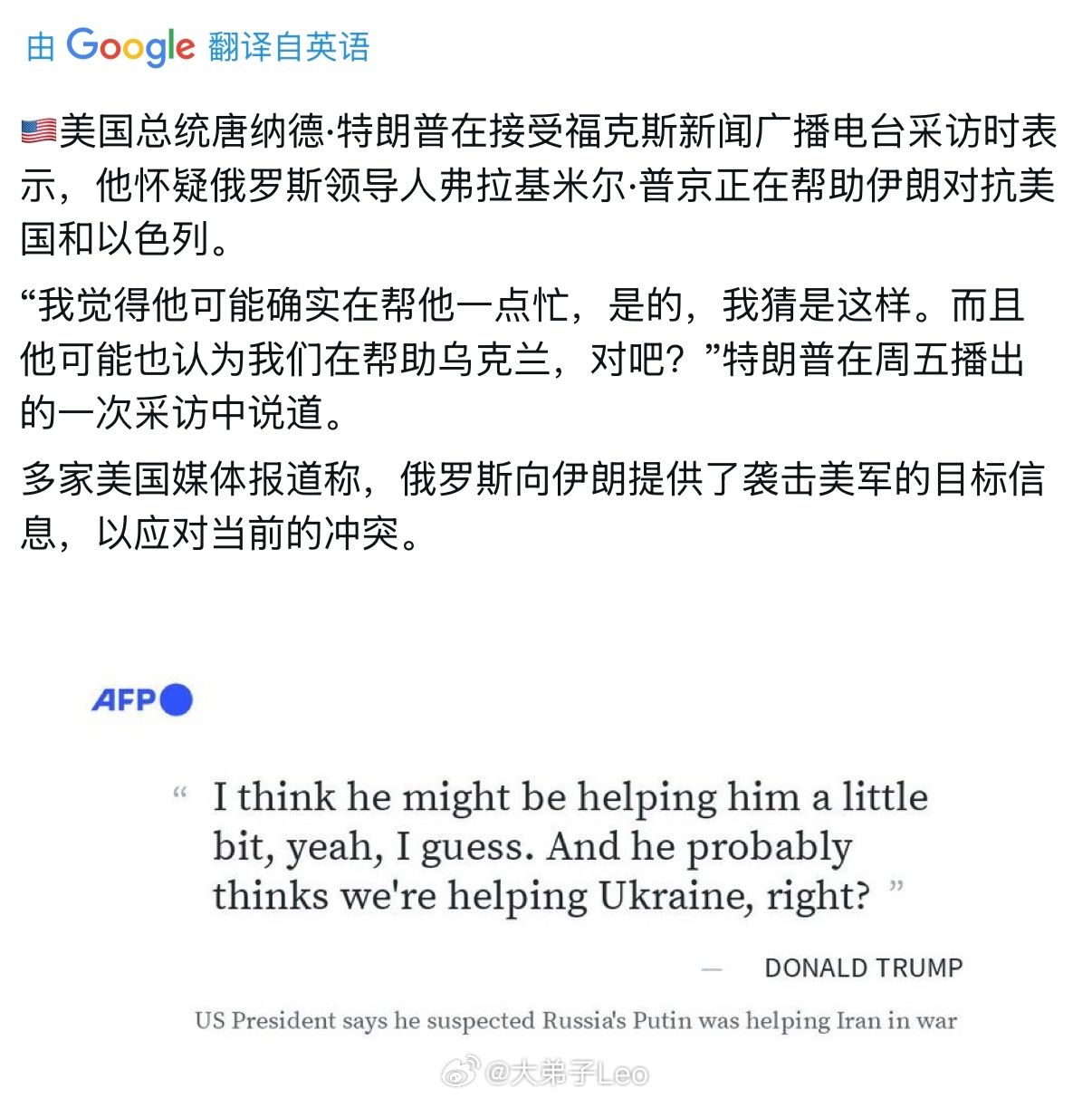 特朗普接受福克斯电话采访表示“我觉得普京可能确实帮了伊朗对抗美国和以色列”伊朗发