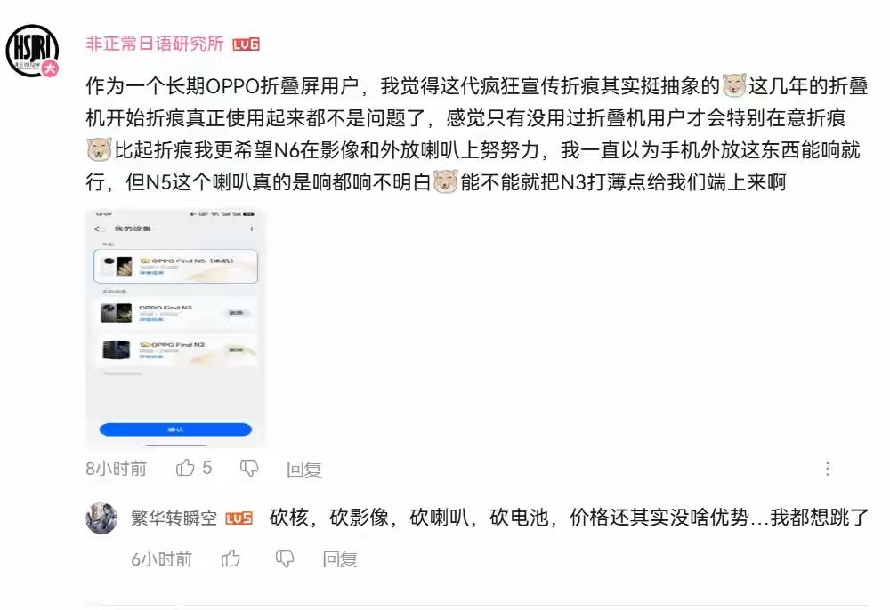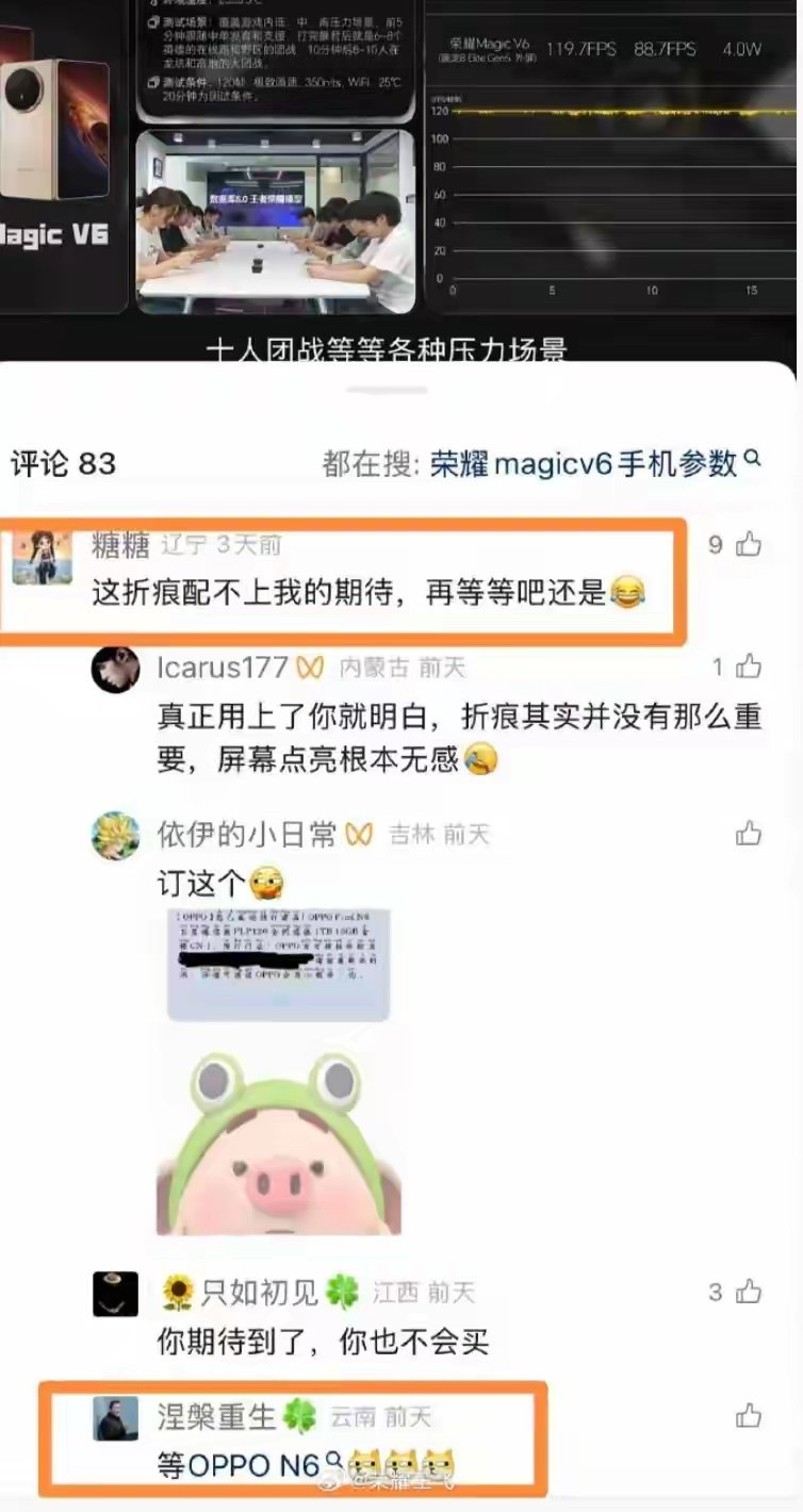 这个宣传方式已经引起了部分网友的吐槽。有网友表示,作为一个长期OPPO折叠屏用户,我觉得这代疯狂宣传折痕其实挺抽象的,这几年的折叠机开始折痕真正使用起来都不是问题了,感觉只有没用过折叠机用户才会特别在意折痕,比起折痕我更希望N6在影像和外放喇叭上努努力,我一直以为手机外放这东西能响就行,但N5这个喇叭真的是响都响不明白,能不能就把N3打薄点给我们端上来啊。
