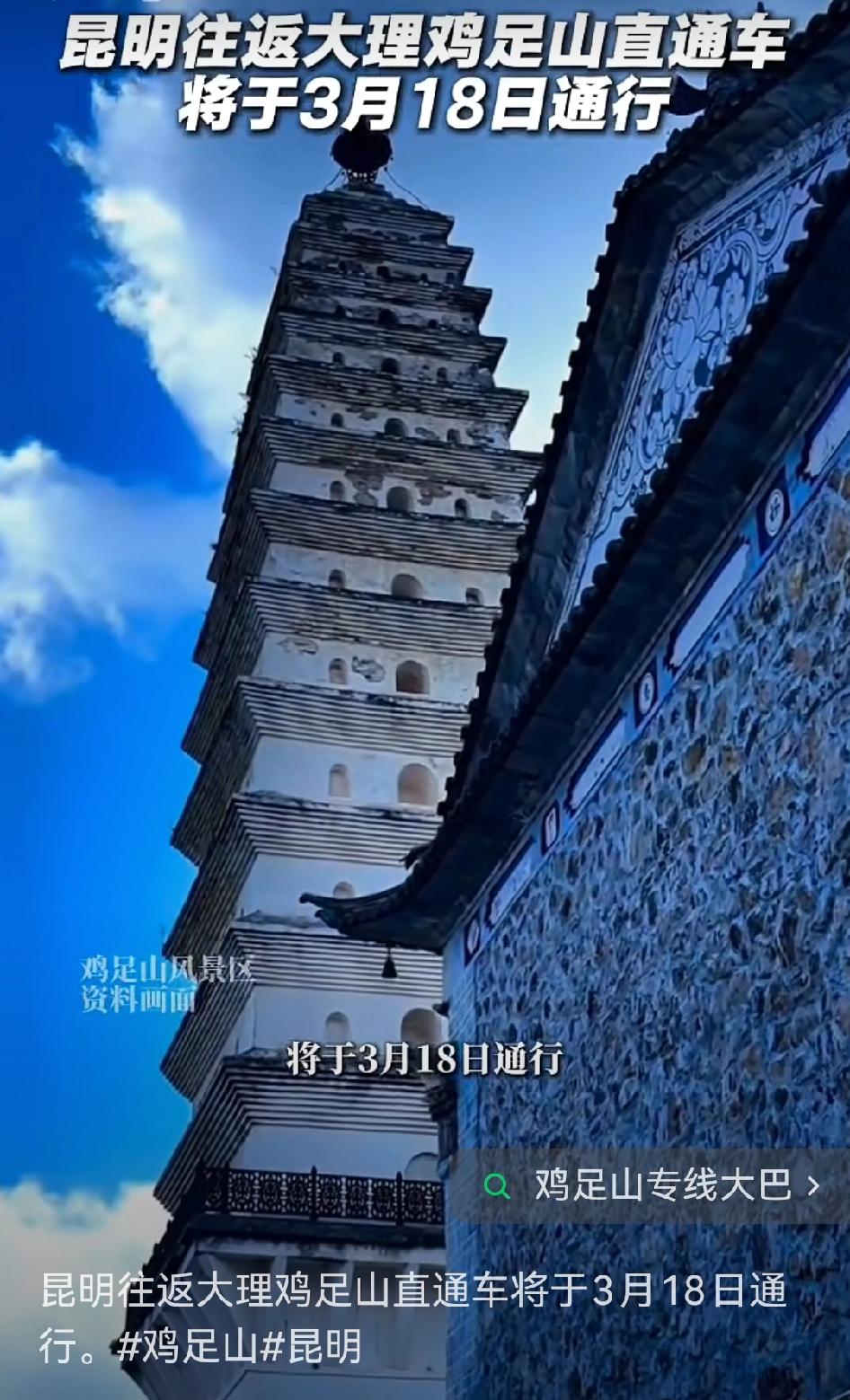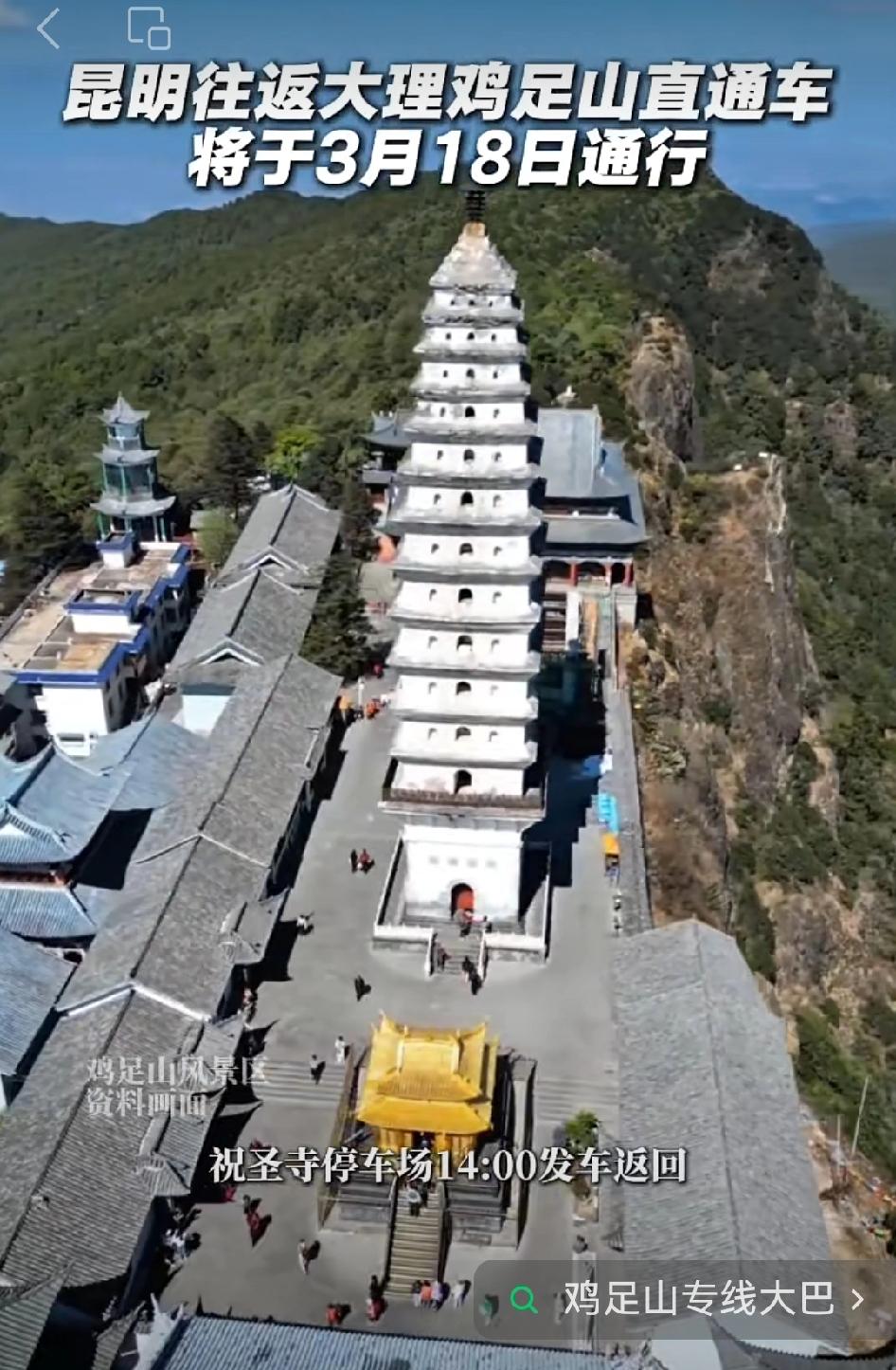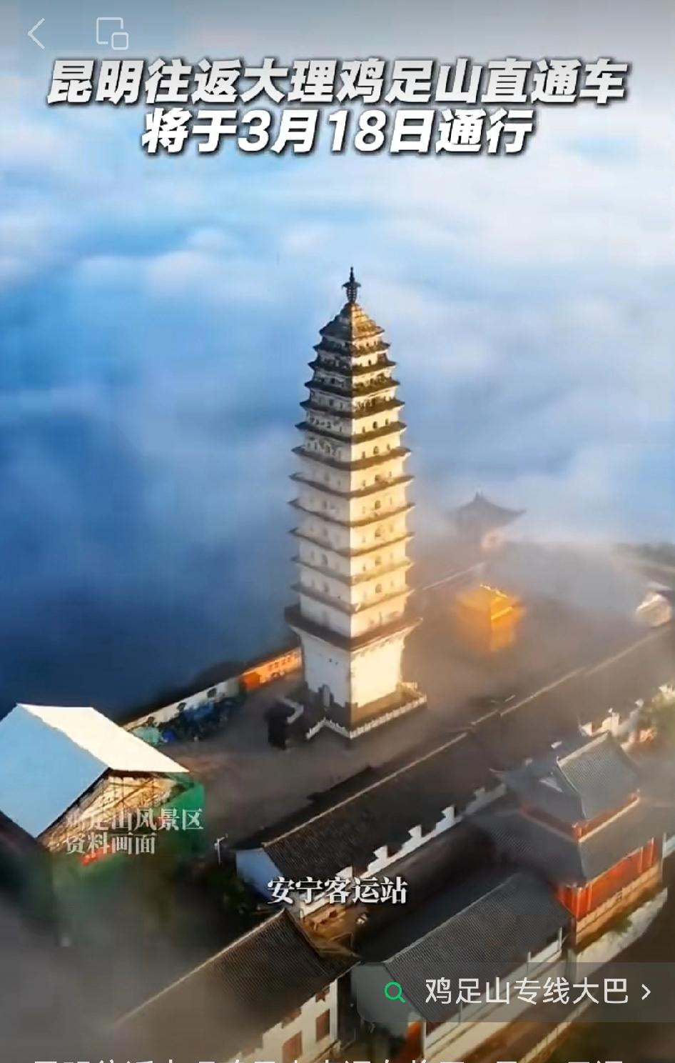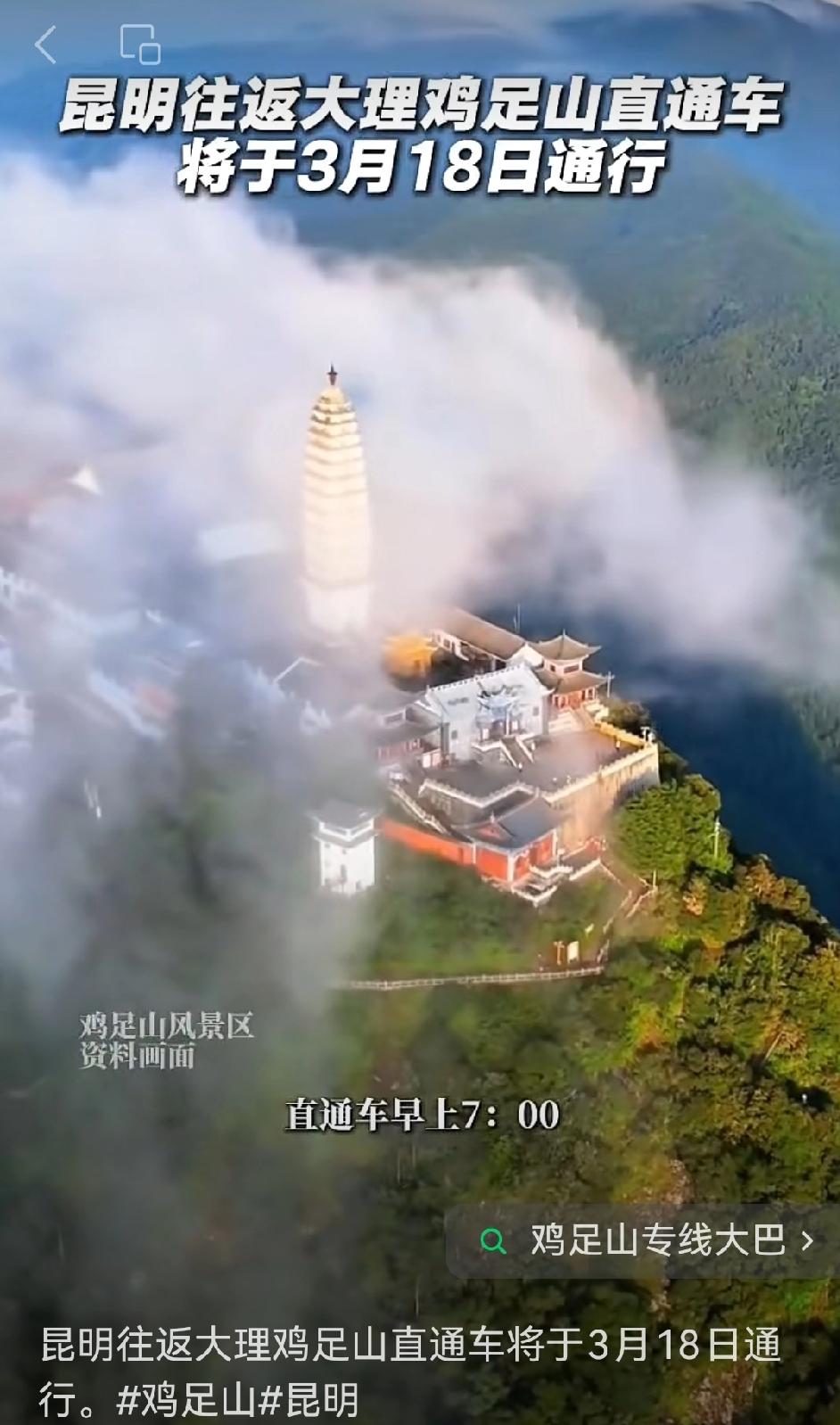 3月18日起,昆明往返大理鸡足山的直通车就要开通啦!这可太便利了。以往想去鸡足山,转车换乘麻烦至极,如今有了直通车,直接就能从昆明直达,节省了不少时间与精力。 鸡足山可是个好去处,它是闻名遐迩的佛教圣地,山上的祝圣寺、金顶寺等寺庙历史久远,建筑风格别具一格。站在金顶,还能俯瞰到壮丽的山川景色。不管是想去祈福,还是欣赏自然风光,鸡足山都值得一游。等直通车开通,我定要去感受一番。