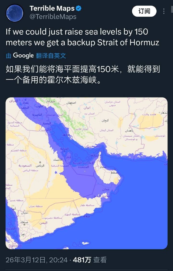 有网友建议:如果能将海平面提高150米,就能得到一个备用的霍尔木兹海峡……