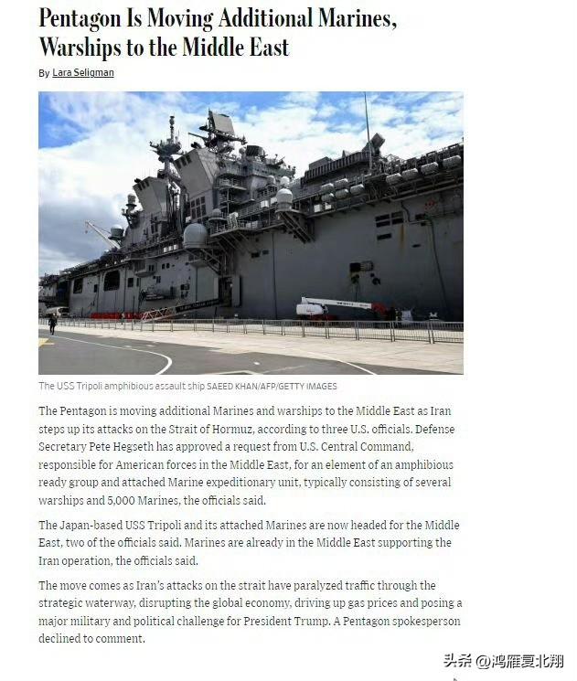驻日美军两栖特遣舰队将被调往中东 面对中东局势紧张,五角大楼下令,驻日美军第七舰队下属的两栖舰队以及附属的5000名海军陆战队成员全体前往中东 Ps:即驻韩美军的所有防空都调走以后,第七舰队也动了,颇有一种大唐安史之乱尽调西域之兵的感觉,帝国真是没兵了。