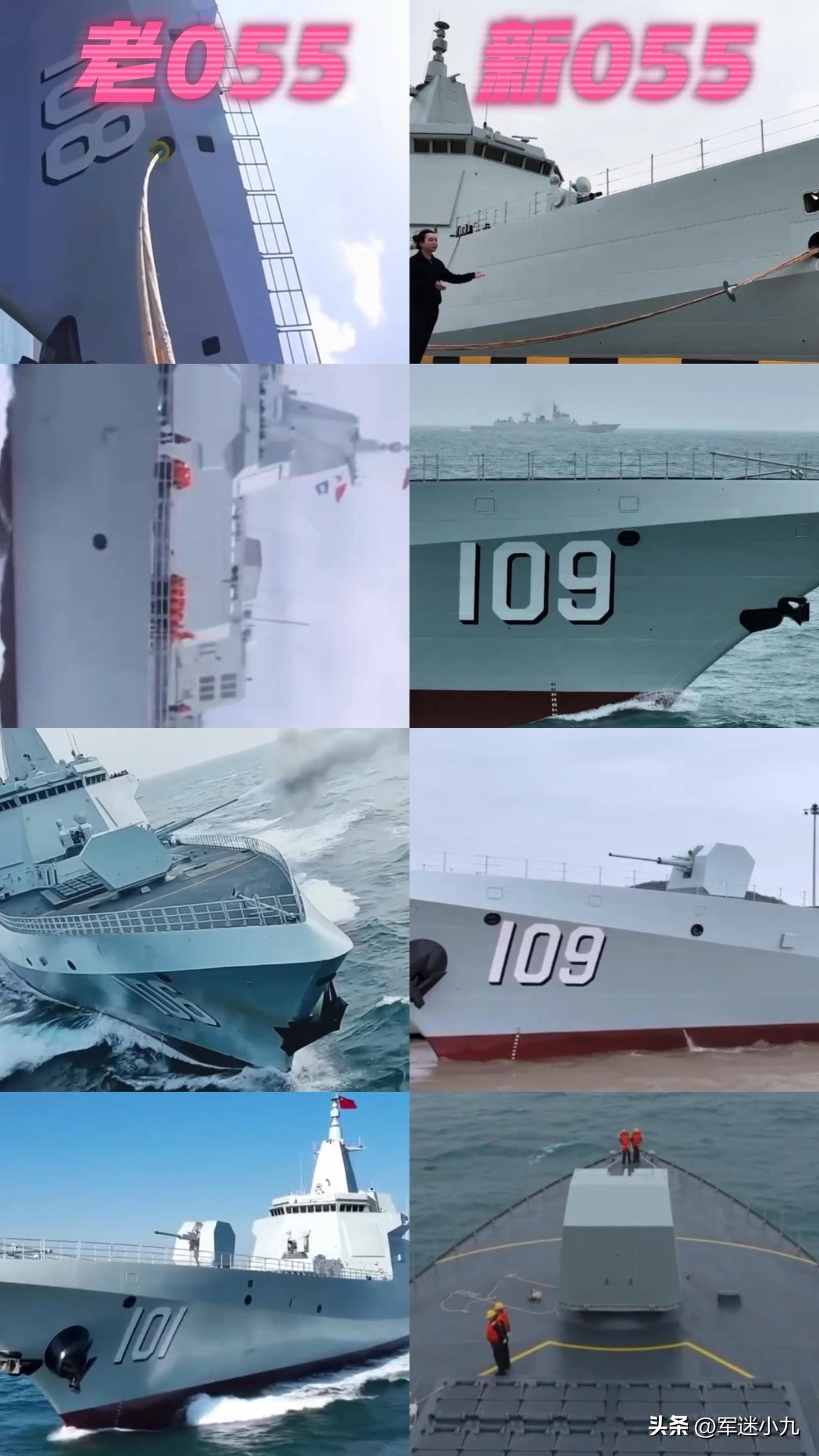 新一代055万吨大驱,外观最大的变化,竟然是这3个? 随着,新一代055大驱的正式亮相,官宣入列,109东莞舰和110安庆舰,各种高清视角画面,逐渐被公开,不得不说,新055,看起来更加震撼和漂亮了! 新一代055,在外观上,到底有哪些变化?个人觉得,最大的变化,莫过于以下3个: 1.新一代055大驱,前甲板130mm主炮炮塔主体上的检修登梯,被取消了,新的主炮看起来更简洁,自动化水平,进一步提高! 2.新一代055大驱,全舰四周围栏样式改变,原来是粗度一样的铁管,而且是分段式的,看起来有些臃肿,现在改成了,只保留立柱,剩下的横向全部采用较细的简洁,看起来更简单,但是感觉没有老款的坚固! 3.新一代055大驱,舷窗数量变少了,由15个变为了11个,由原来的4-7-4的布局,改为现在的3-5-3的布局,单块玻璃面积更大,视野更开阔! 同时,报道中也提到新一代055,烟囱风帽优化设计,更向后朝向,更好的排烟,不会熏到前面顶层设备,但是,我对比了,好像不是太好辨别和以前的烟囱风帽变化程度,所以,没有做风帽的对比图! 大家还发现新一代055外观上,有哪些改变? 欢迎在评论区说说你的看法!