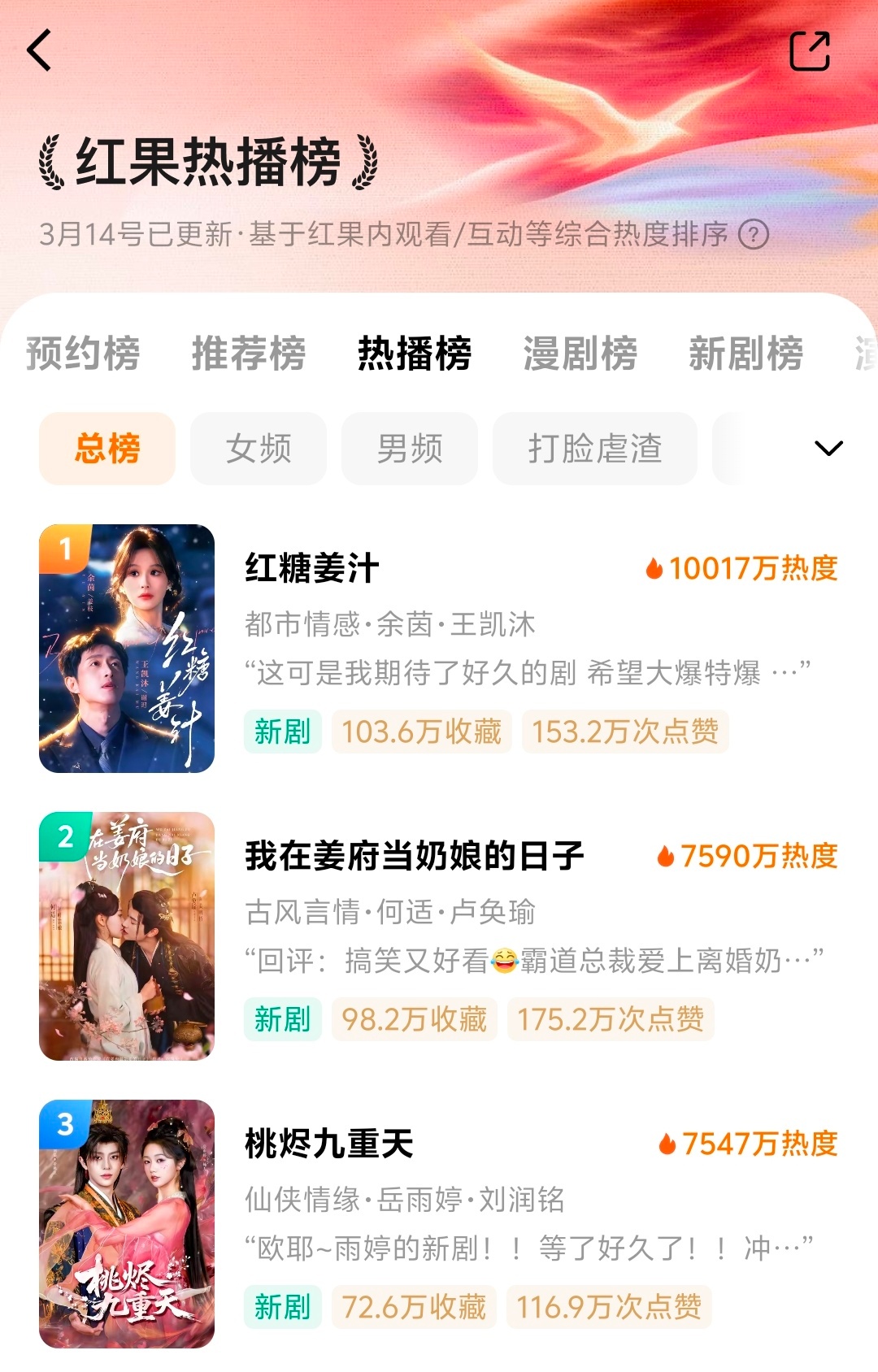 《红糖姜汁》首日登顶 10017 爆开岳雨婷 刘润铭《桃烬九重天》,岳雨婷巴黎归来也开出了个人最高首播成绩