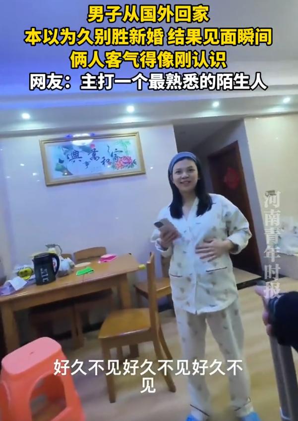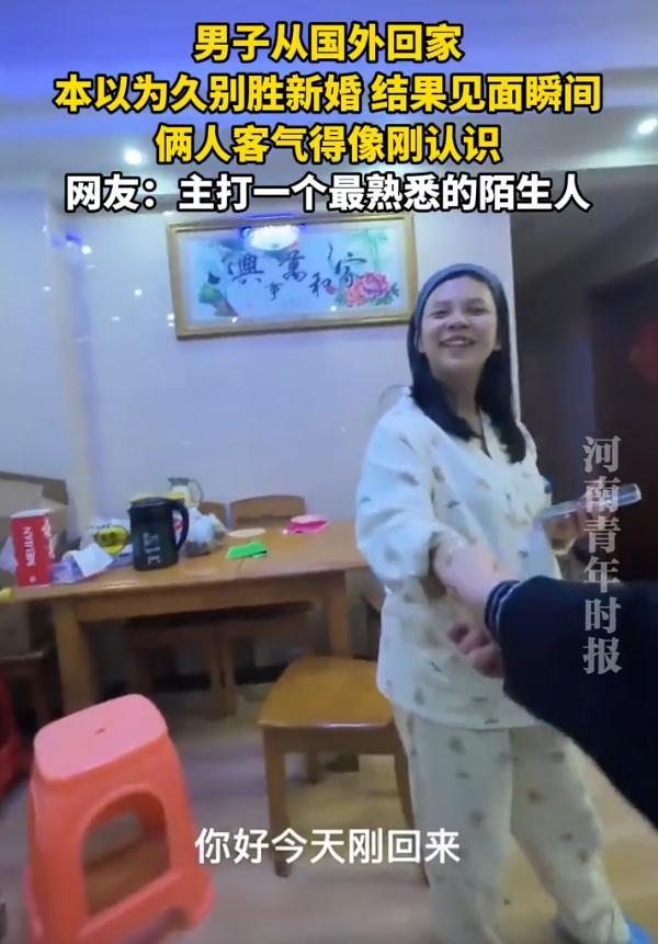 笑着笑着就沉默了!广东,一男子从国外回家,本以为见到妻子后会小别胜新婚,没想到,房门打开,两人四目相对的一瞬间却都沉默了,互相之间突然都不知道说些什么,反倒客气的像是刚认识一般,网友:距离不会产生美 男子被公司安排到国外,一出门就是好几个月,这次回来,他并没有提前告知,想要给妻子一个惊喜,谁知开门却和她想象的不太一样,两个人都没有那种小别的激情,反倒是妻子肚子里怀了他的宝宝,让他很是意外 在简单寒暄后,妻子伸出手,特别客气地说:你好,刚回来啊?而男子条件反射一样握住那只手,规规矩矩回了一句:嗯,刚到 两个结婚好几年的人,就这么面对面站着,像初次见面的生意伙伴,握了个手 两个人说话都不敢大声,生怕打扰到对方。整个家安静得不像家,倒像两个人刚搬进一间合租屋,还在小心翼翼的磨合期 之前总是有人说距离产生美,我看这话得改改,距离产生的是客气 夫妻之间最怕的不是吵架,是突然变得客气。吵架好歹还是真性情,客气起来,那就是真的生分了。男子和他老婆反应,不是感情淡了,是太久没在一块儿过日子,一时半会儿没找着那个相处的节奏 所以说啊,夫妻之间那点事,真没那么复杂。几个月不见,见面了不会相处,这不丢人。只要还愿意给对方倒水,还愿意半夜爬起来揉腿,那点客气劲儿,迟早会过去的 男子从国外回家 夫妻客气得像刚认识