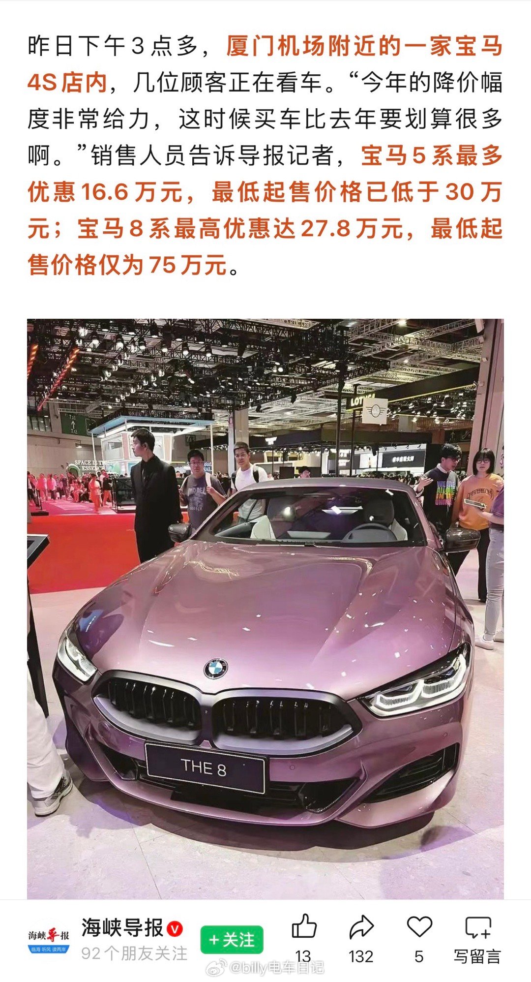看到厦门官媒的一篇新闻,传统豪华车型正在大幅降价,优惠完的奔驰GLE轿跑还要63万?宝马8系仅75万这个“仅”字用的真巧。