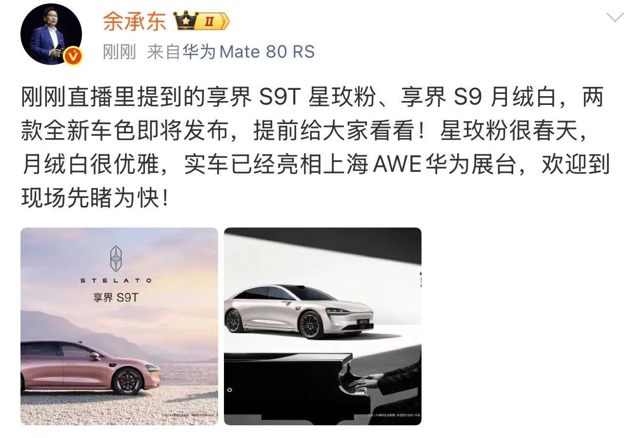享界粉白新色亮相上海AWE 余承东与央视主持人尼格买提直播中,公布享界S9T、享界S9分别推出星玫粉、月绒白两款全新配色,同步发布全新豪华轮毂。我昨天去AWE现场,还没看到这两台新色,应该是昨晚运进去的