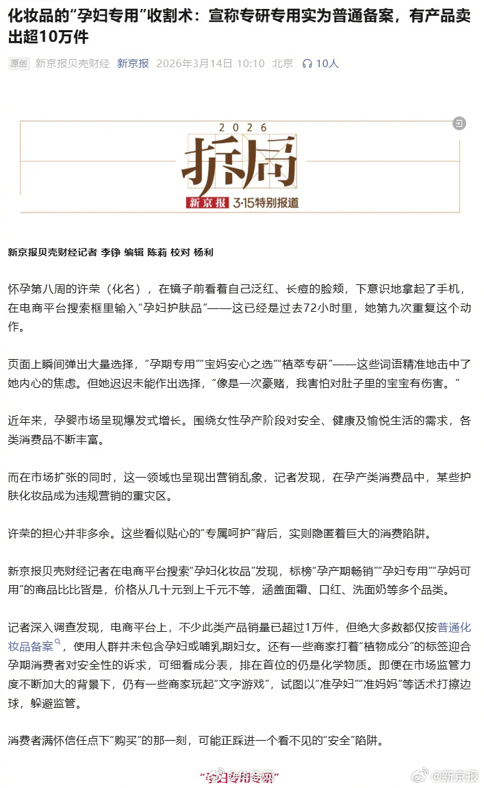 天眼查信息显示,2025年6月,蔻蔻琪生物科技(杭州)有限公司被杭州高新技术产业开发区(滨江)市场监督管理局作出行政处罚。主要违法事实显示,该公司在某电商平台销售的“AG抗糖小金罐3.0水乳精华液cocochi超值套装之AG抗糖小金罐2.0/3.0”,声称“孕妇适用”。#315拆局##315一追到底##315骗假不留#“孕妇专用”成收割工具:普通备案化妆品披上“专研”外衣 卖出10万+