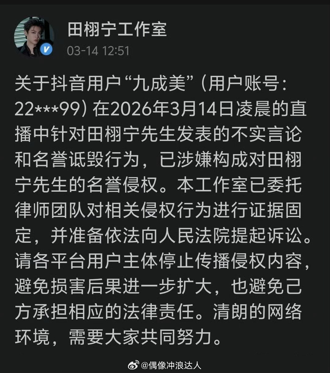 田栩宁工作室告了九成美。。粉丝头像嫂子拍的田栩宁白背心