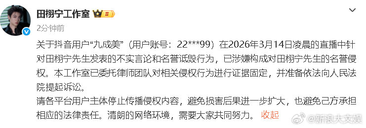 田栩宁工作室将起诉九成美田栩宁工作室发声回应 14日,回应九成美直播爆料热议,称相关不实言论和名誉诋毁行为已涉嫌构成对田栩宁先生的名誉侵权。“工作室已委托律师团队对相关侵权行为进行证据固定,并准备依法向人民法院提起诉讼。”