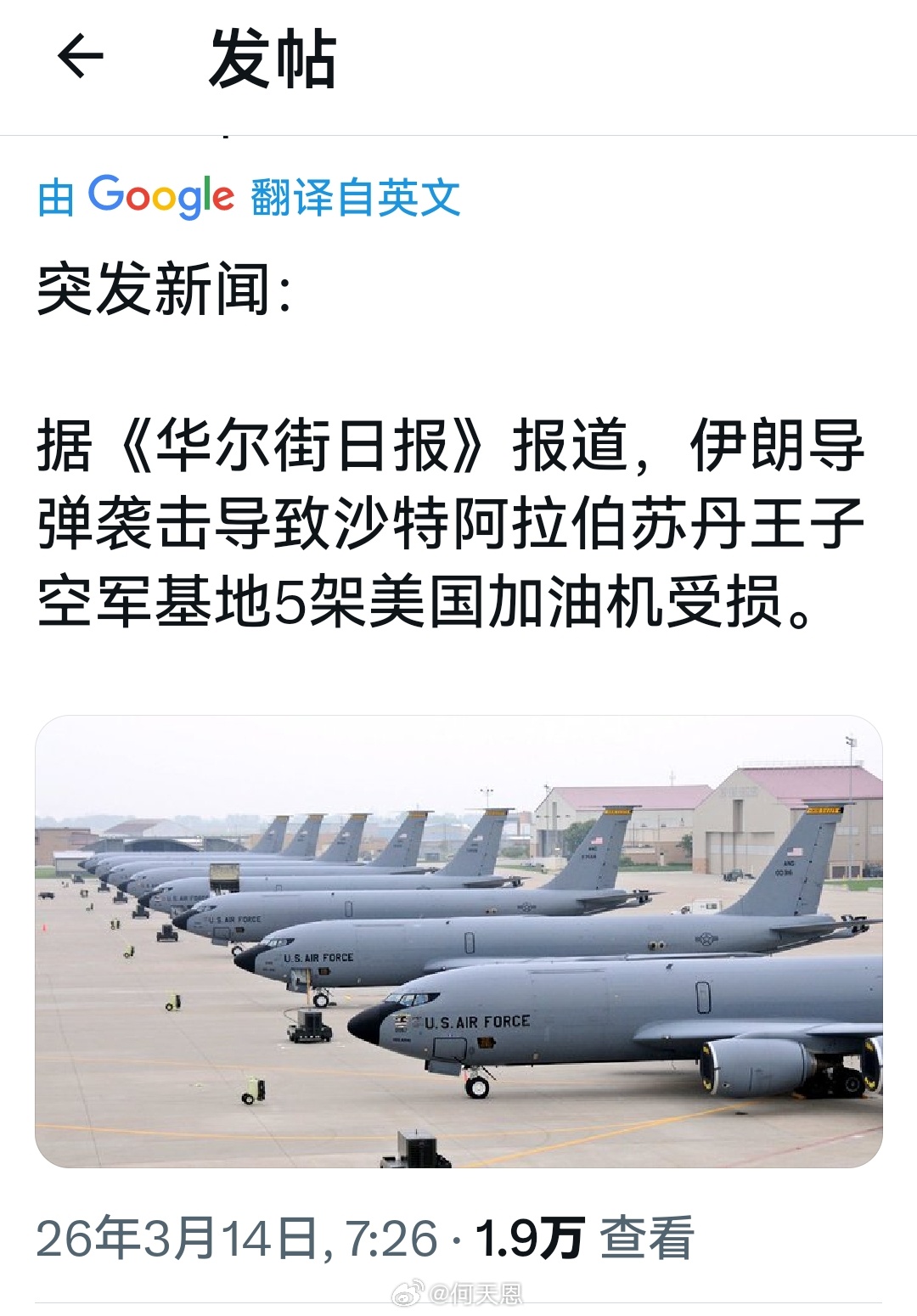 据《华尔街日报》报道称:一枚伊朗导弹击中了沙特阿拉伯的苏丹王子空军基地,致使停在那里的五架美国空军空中加油机被毁。
