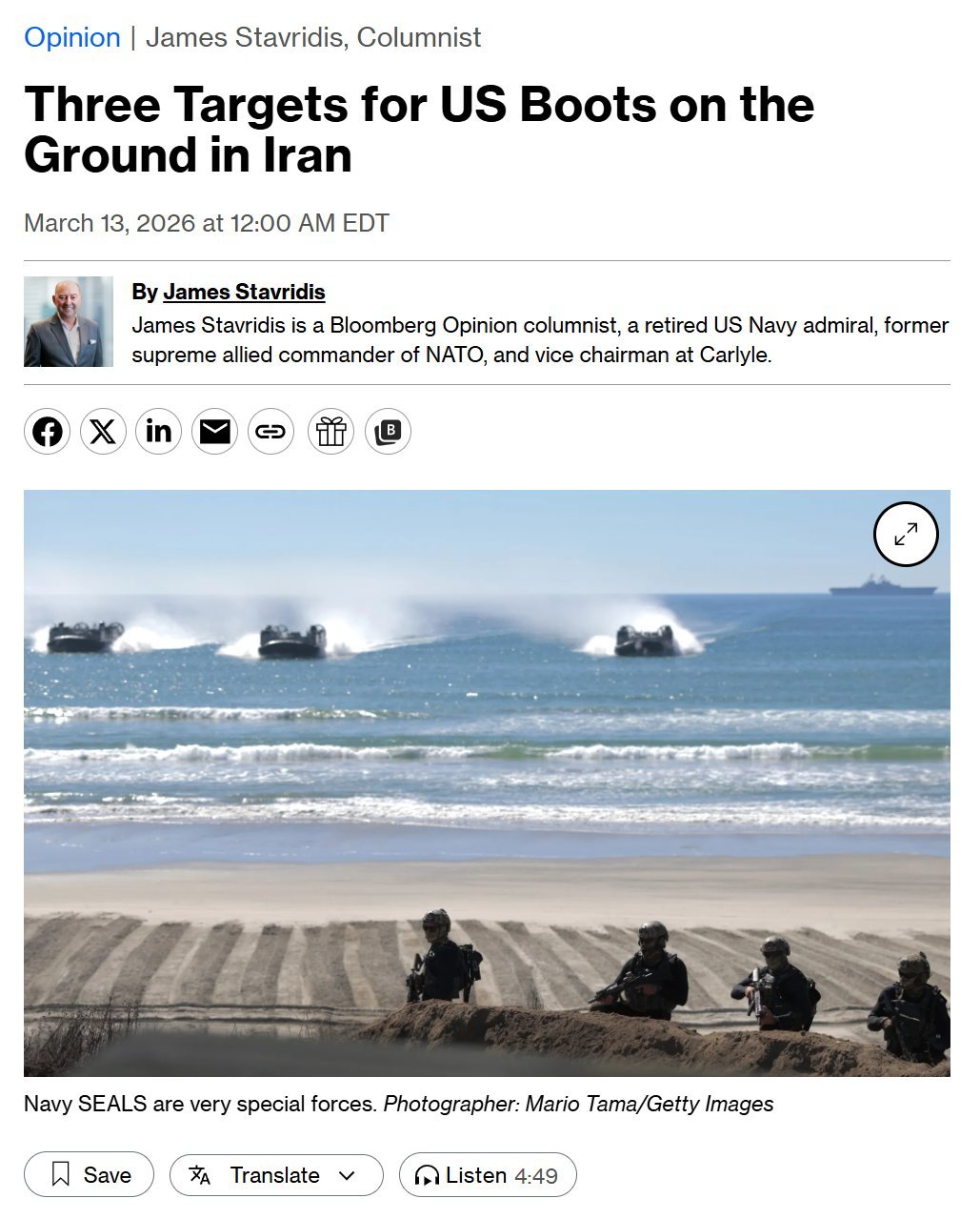 ² 这些人配备了F-35B战斗机、V-22鱼鹰导弹,像是打仗去的。能派2500,就可能增派5000、1万。图2:北约盟军前司令、退役海军上将James G. Stavridis在彭博社的观点:“美军特种部队绝对正在筹划极度危险的地面行动,目标大概率是三个:直奔浓缩铀原料、拿下哈尔克岛、扶持反抗军”。