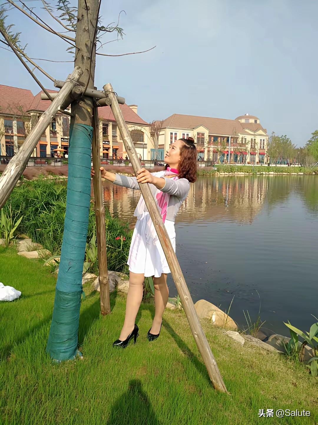 阳光明媚的午后,优雅女子在湖边轻抚树干,享受宁静时光。