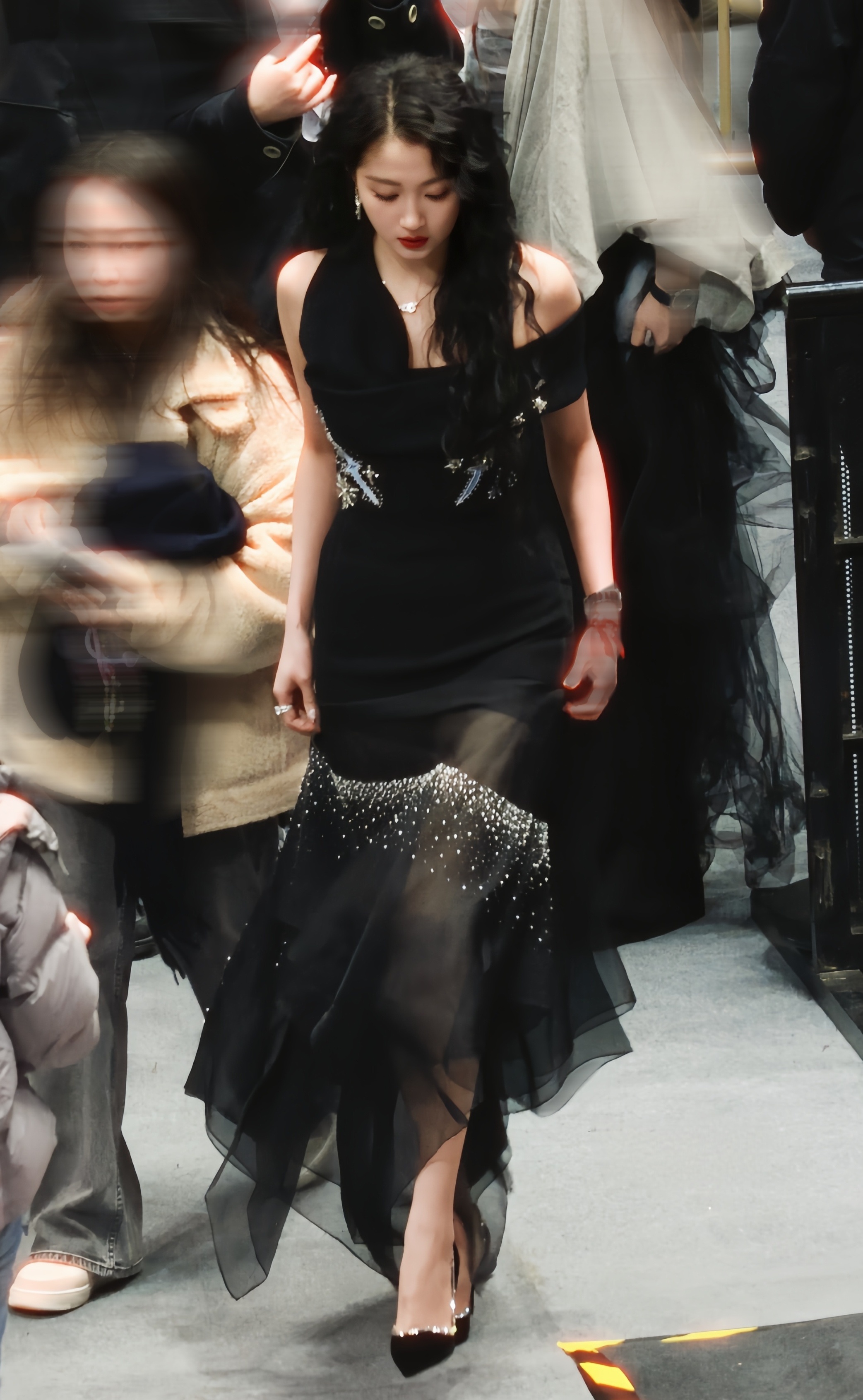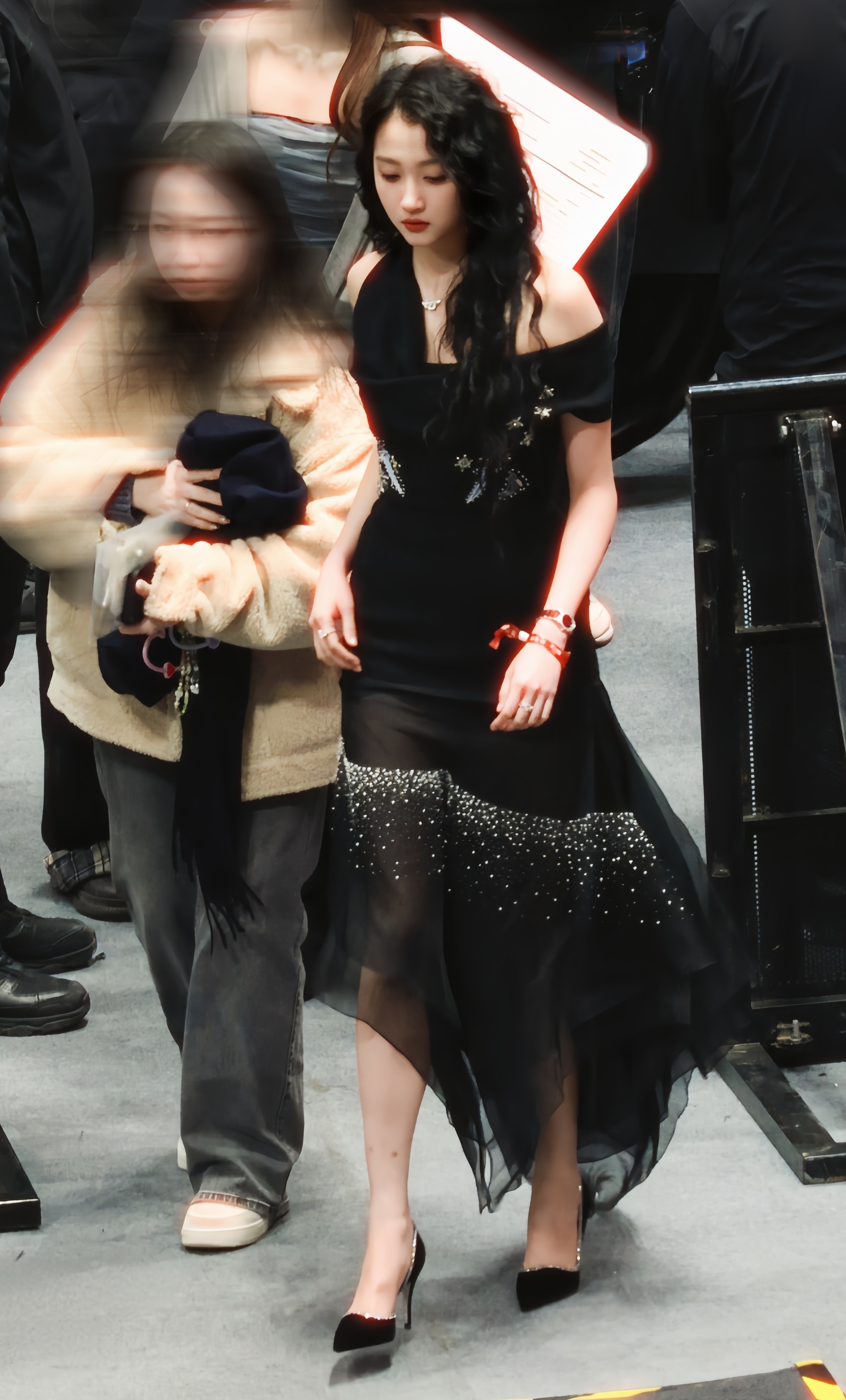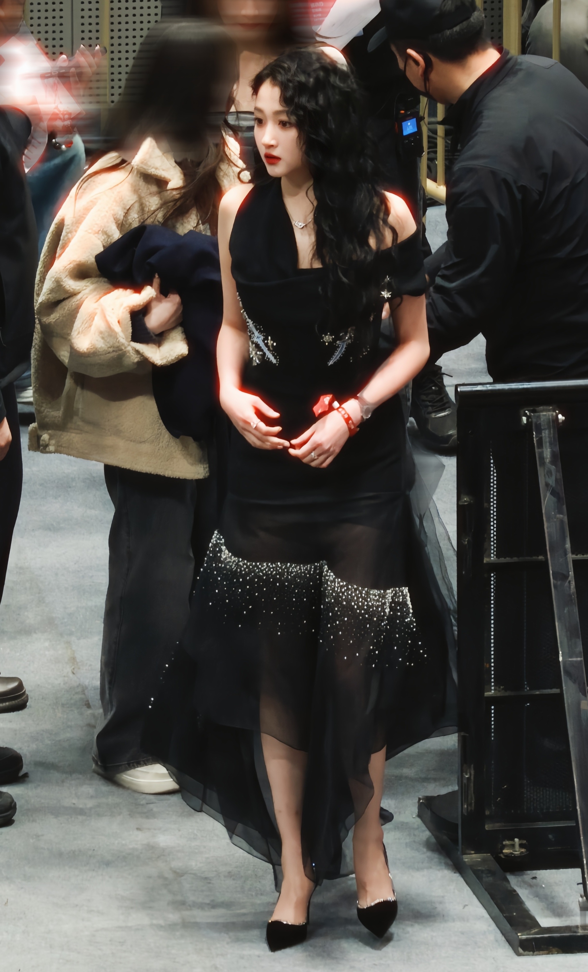 上海F1偶遇关晓彤晓彤黑色星星纱裙黑色高跟鞋