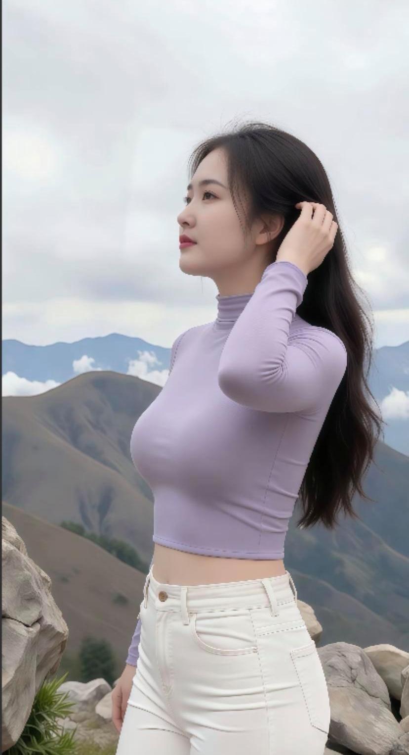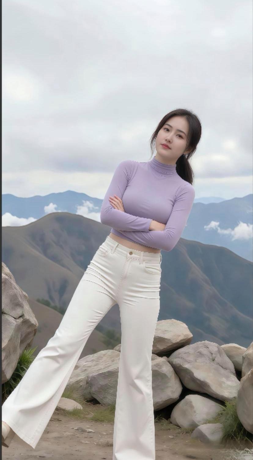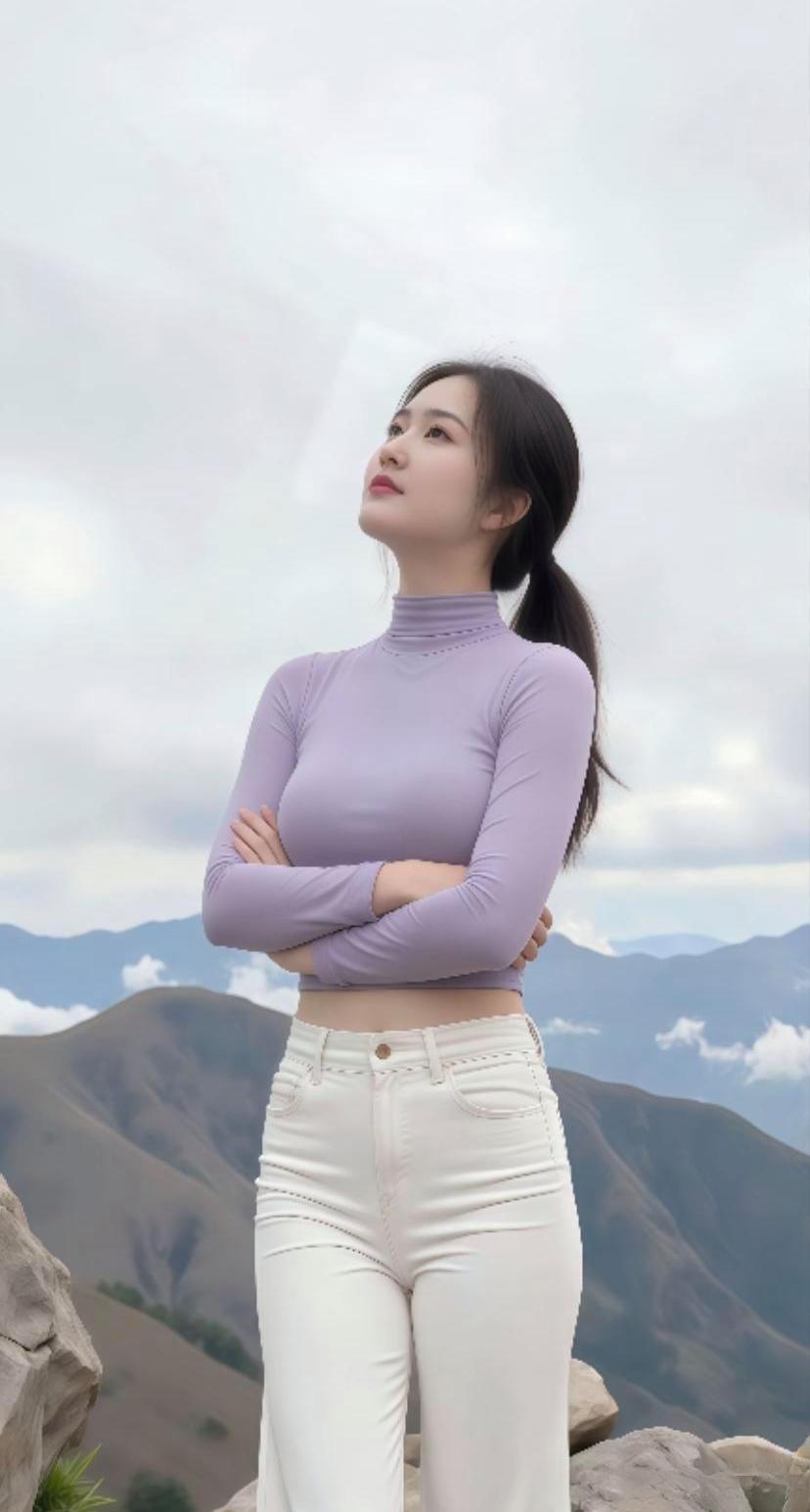 山间少女,紫色高领衫与白色牛仔裤的完美搭配,尽显自然与时尚。