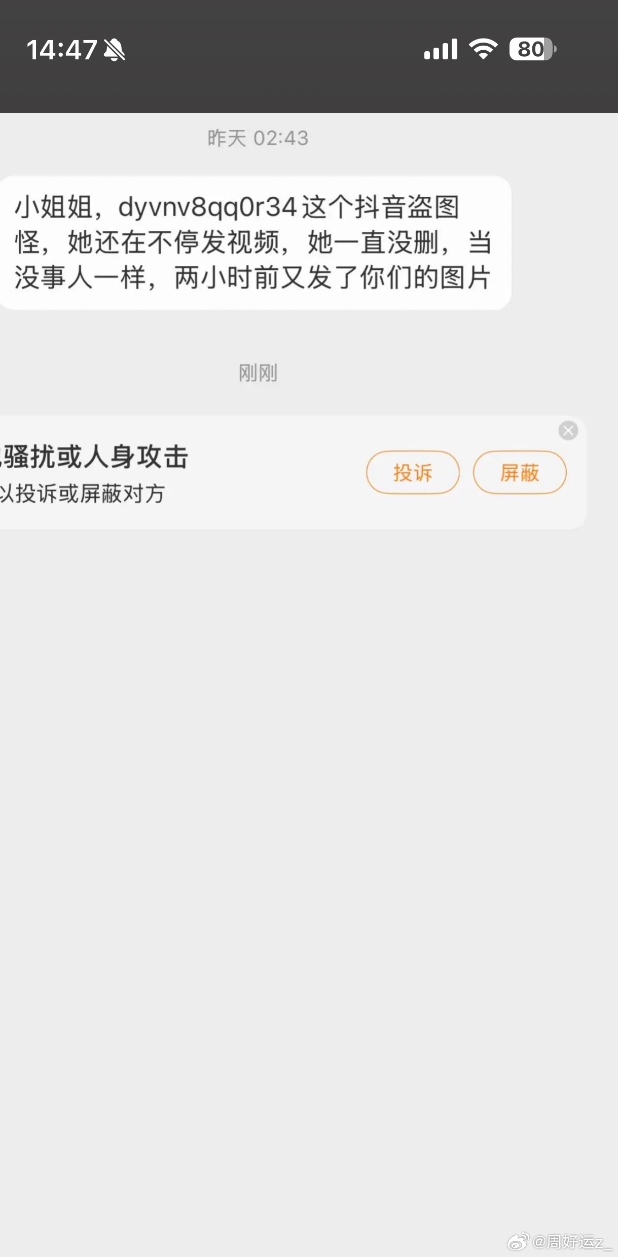 dy:dyvnv8qq0r34(所有人帮我去点举报穷怕了不是你不劳而获拿来行骗的理由!除非你是个没有手脚的是残疾人 ,如果不是残疾人就停止你的恶心行为! 越来越变本加厉👍🏻天天盗我和我姐妹图片视频,莫不是喜欢上我了?既如此,给你个机会我们就在线下,在帽子叔叔那里见 一会儿私密账号,一会儿公开账号来回切换,这么爱玩捉迷藏呢小姐姐😄(我的粉丝们都帮我监控着呢,你继续👍🏻继续你的盗图行为不要停,我这边等着收集证据