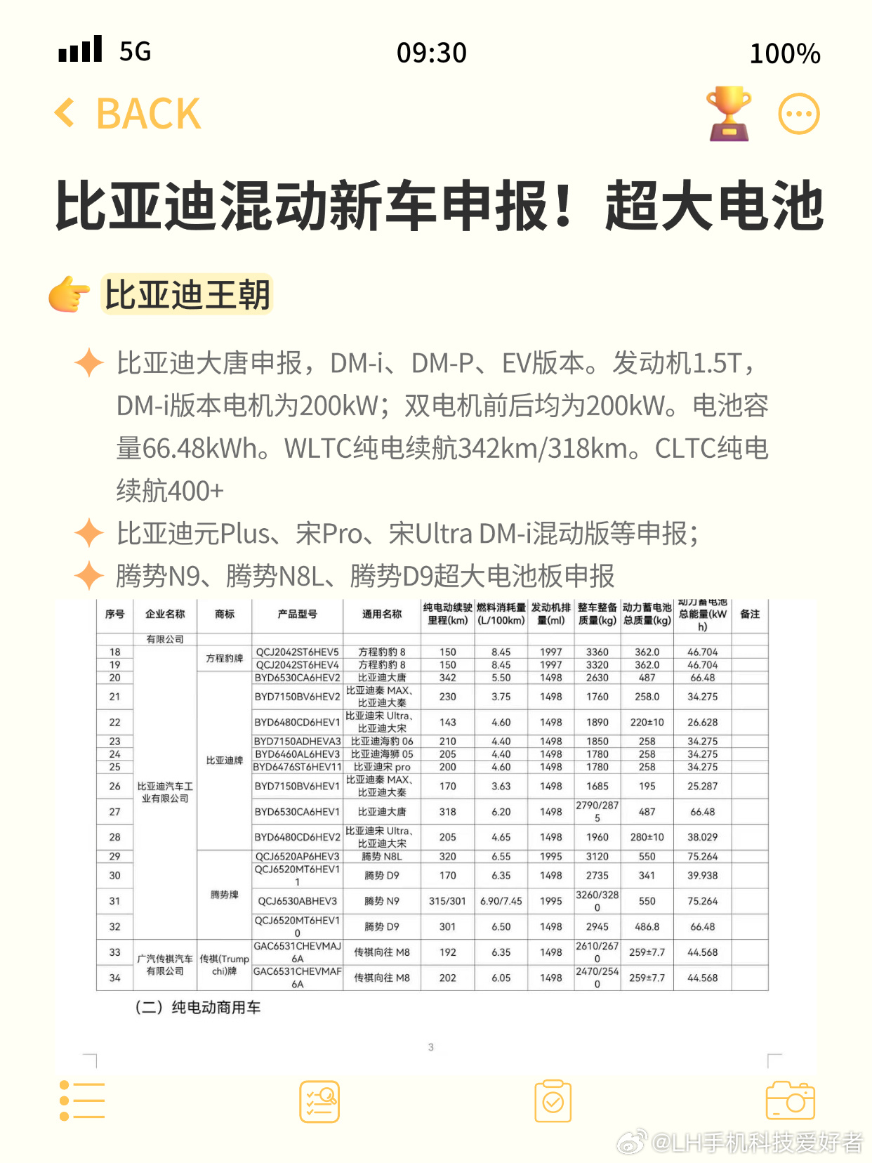 还有,腾势N8L、腾势N9均申报了75度超大电池包,WLTC纯电续航都超过300km,CLTC纯电续航里程也都在400km这一块。包括腾势D9,也申报了大电池版本,这些车型都是第二代刀片电池并且支持闪充技术。