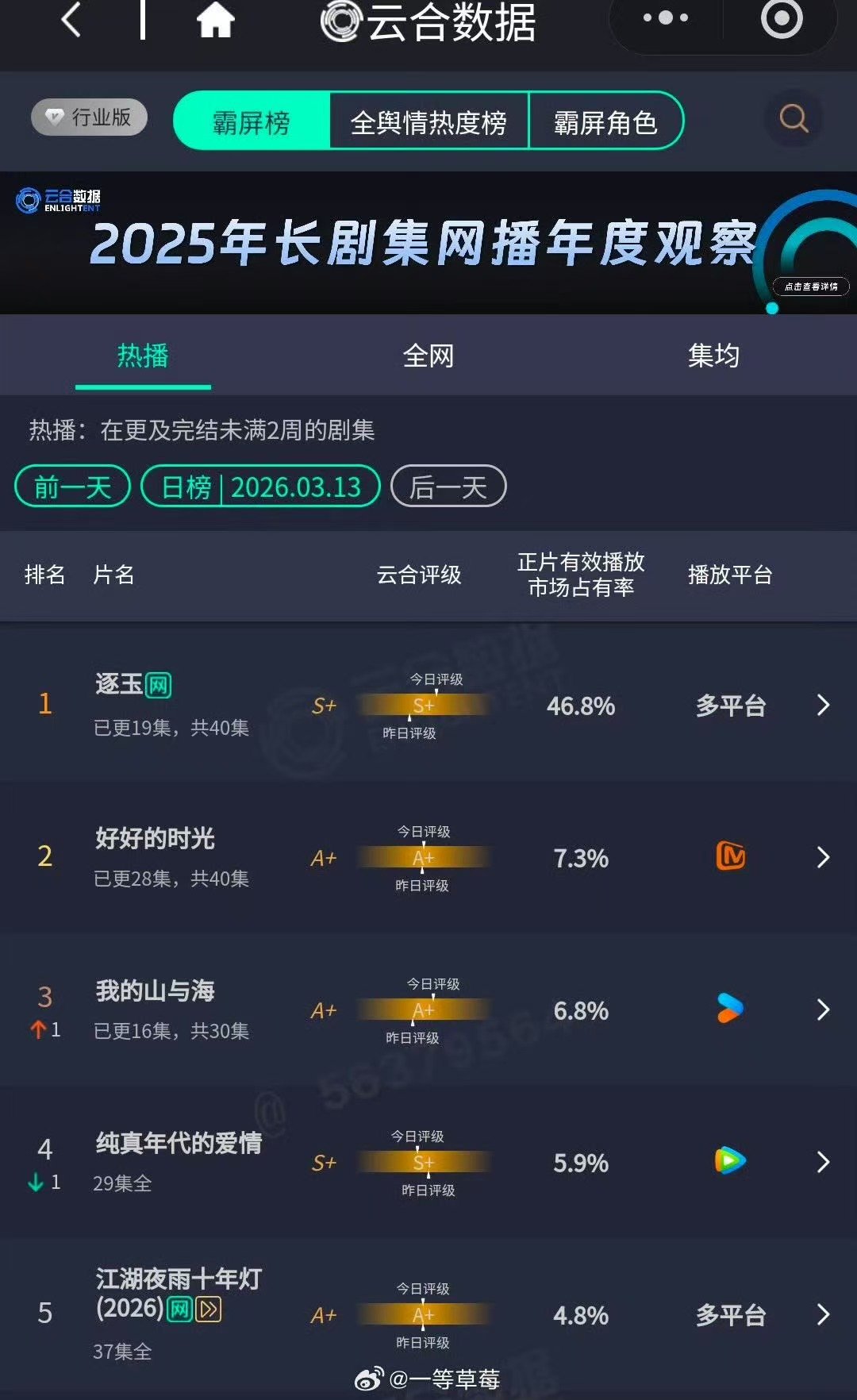 逐玉云合市占率历史第三逐玉云合46.8%超过生万物历史第三了