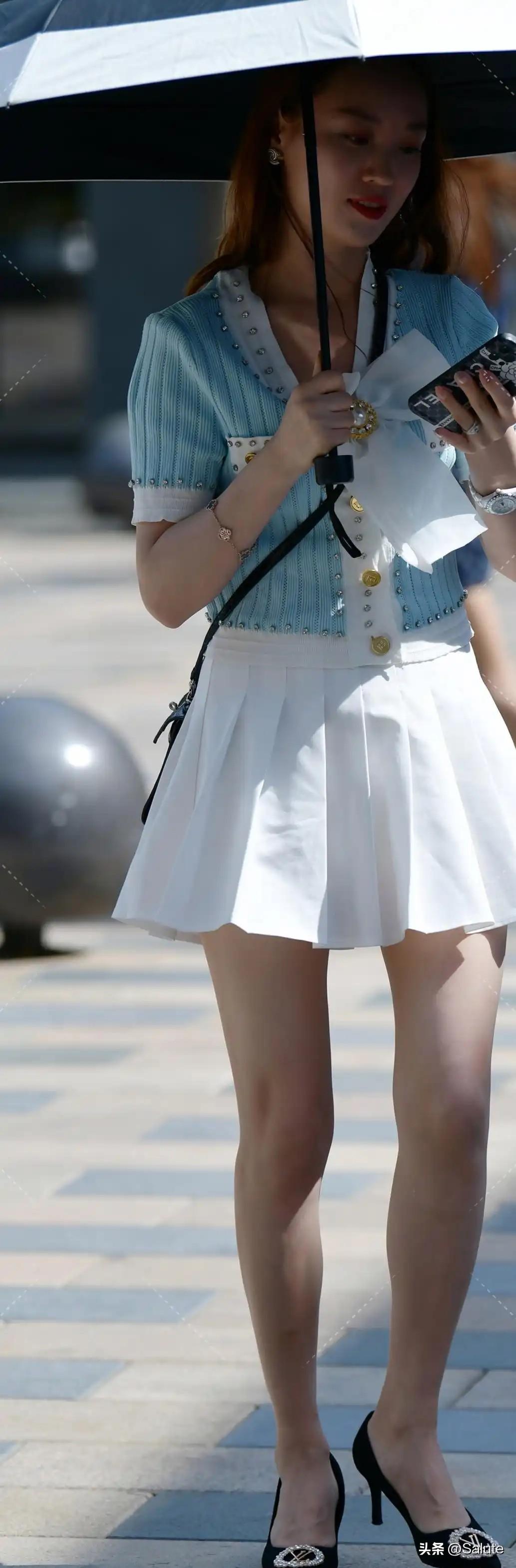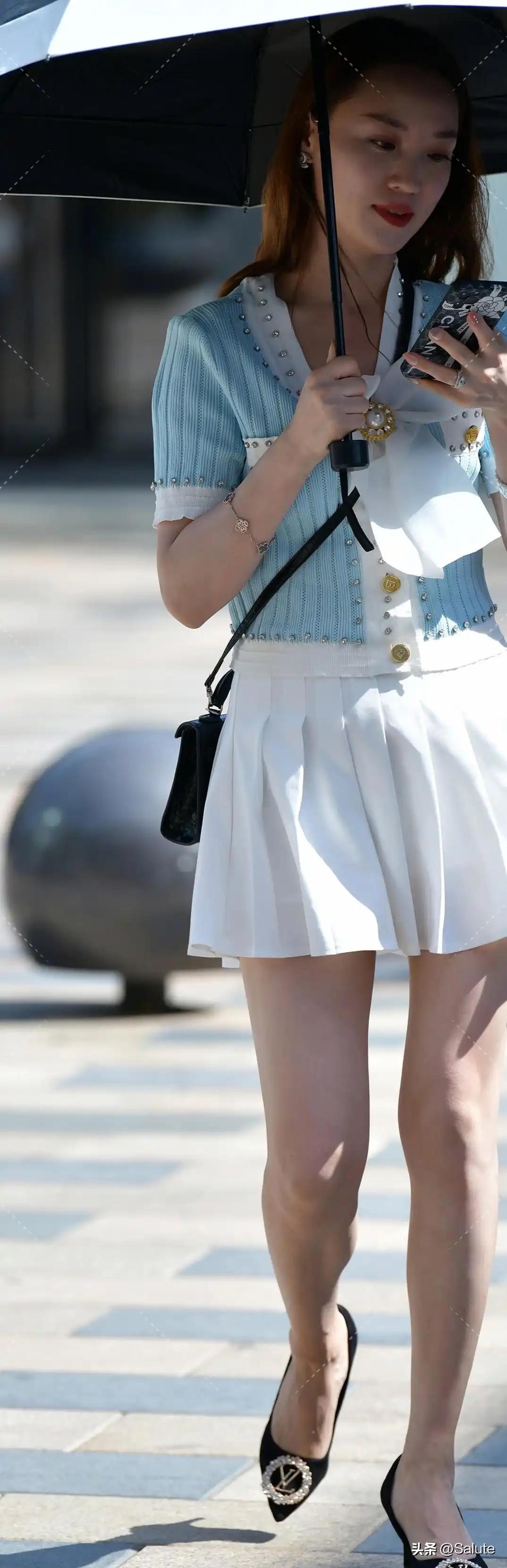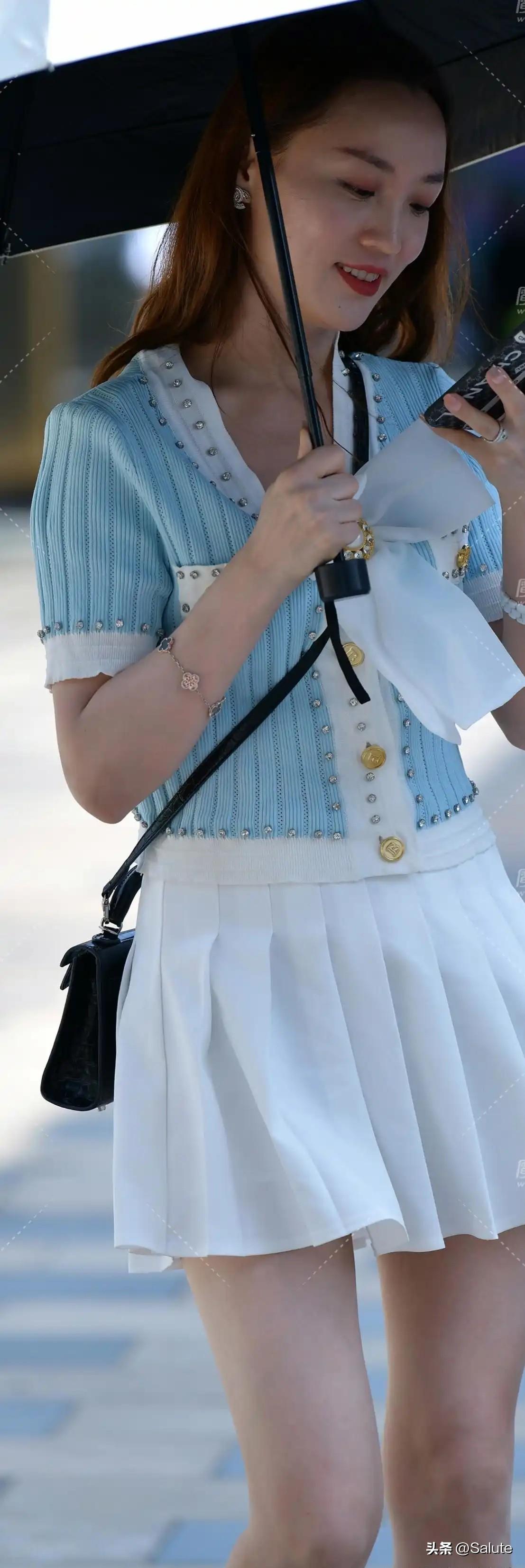 清新夏日穿搭,蓝白条纹连衣裙,搭配黑色小包,伞下漫步,甜美又时尚!