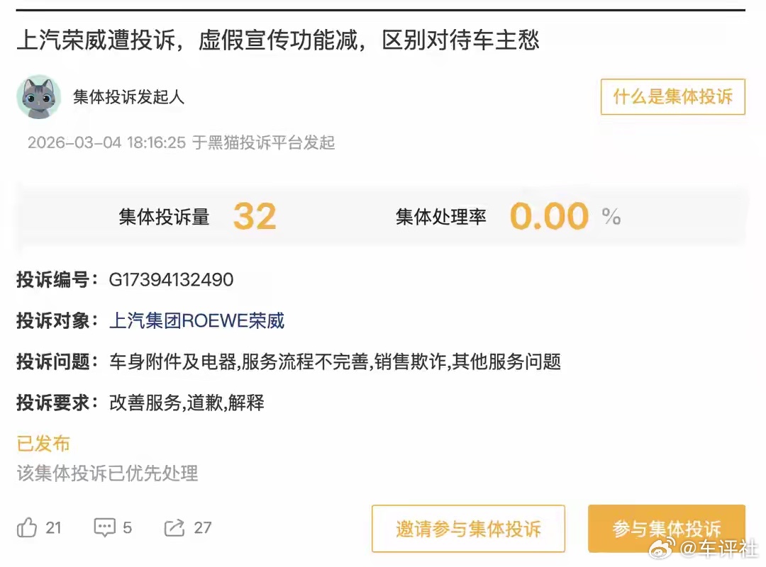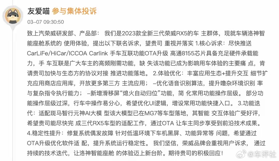 这场集中维权看似聚焦车机体验,实则暴露品牌在智能服务、售后响应与用户权益保障上的短板,更是对荣威产品全生命周期服务能力与品牌信誉的严峻考验。值得注意的是,上汽荣威RX5是否会在大量投诉后给出OTA升级承诺呢?车评观察