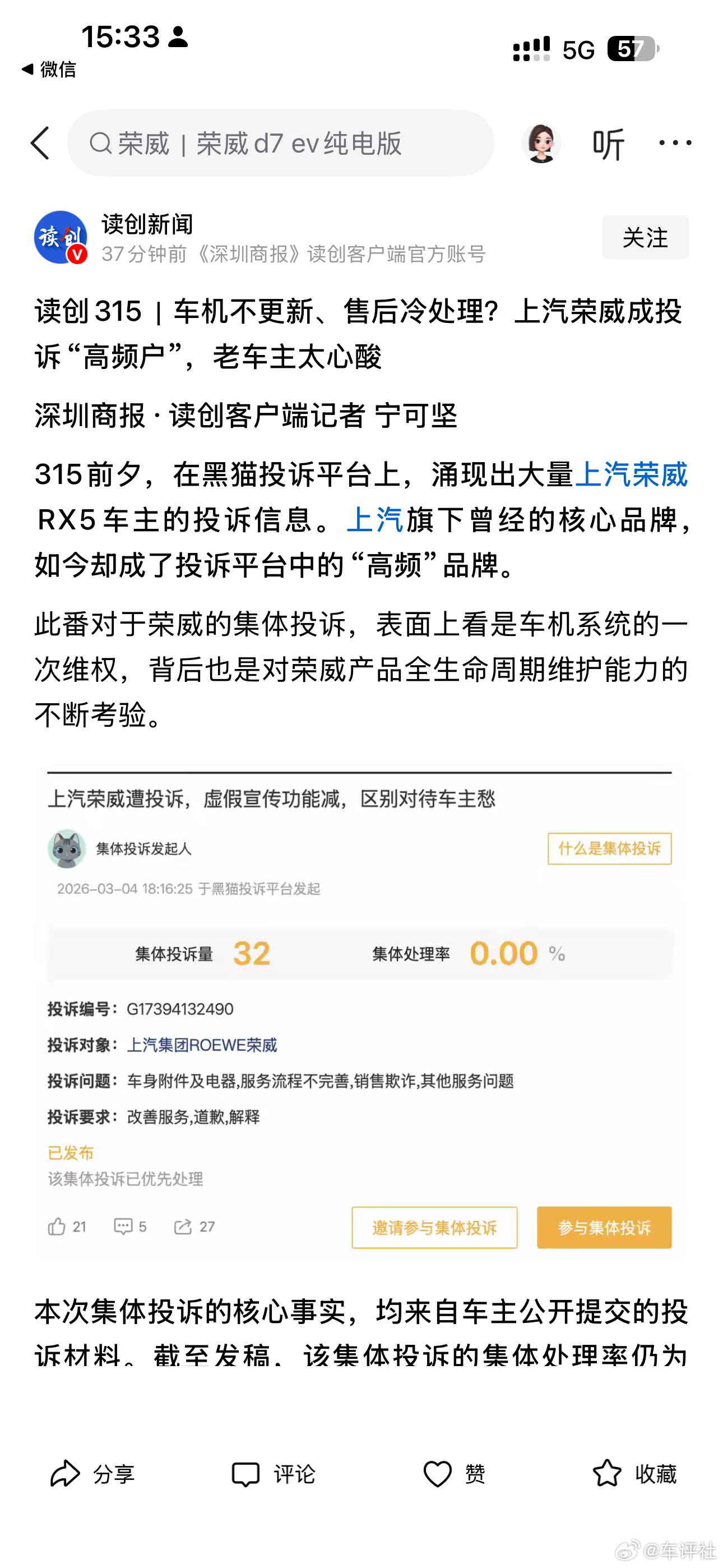 汽车315 【车机不更新、售后冷处理?上汽荣威成重点投诉对象】近日,投诉平台集中出现大量上汽荣威RX5车主维权信息,曾是上汽核心主力的荣威,如今频繁登上投诉榜单。