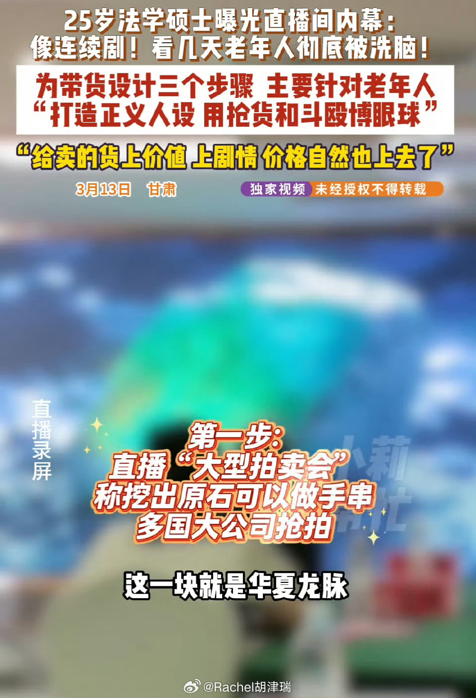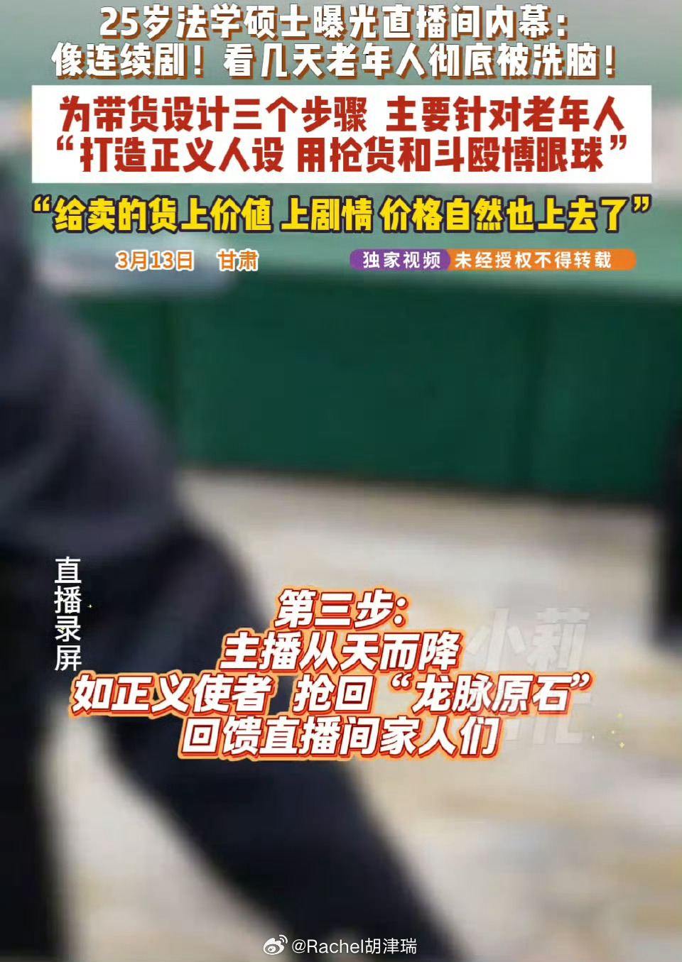 25岁硕士曝光剧本直播间被死亡威胁法学硕士为救母卧底曝光剧本直播骗局,反遭死亡威胁、家庭住址被扒,这何止是行业乱象,更是赤裸裸的违法嚣张!退休工资2000的老人被忽悠买999元“开光木料”,封建迷信、虚假演绎、情感套路轮番收割中老年群体,曝光后直播间换马甲复播,举报者却被辱骂威胁,离谱又可恨!