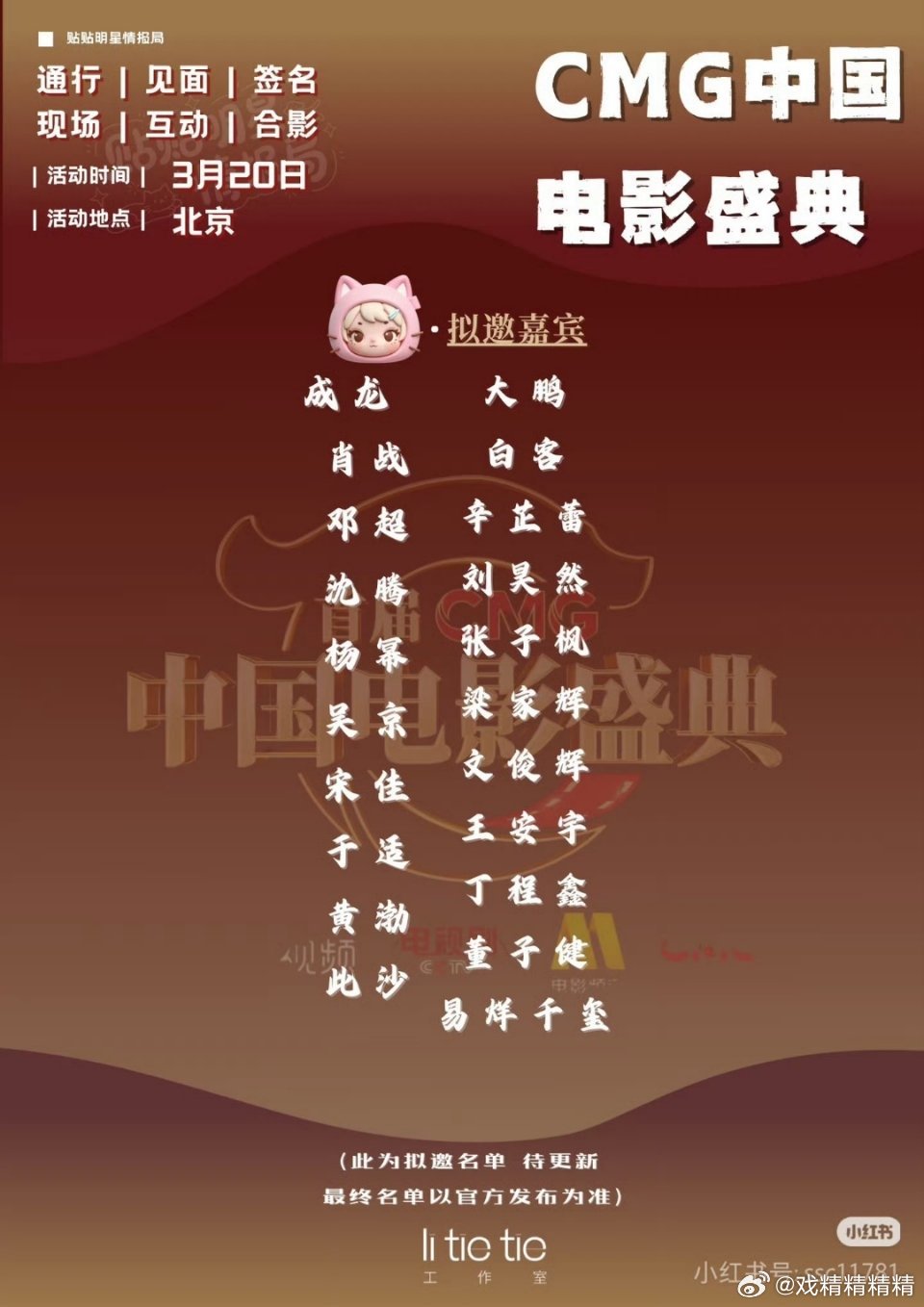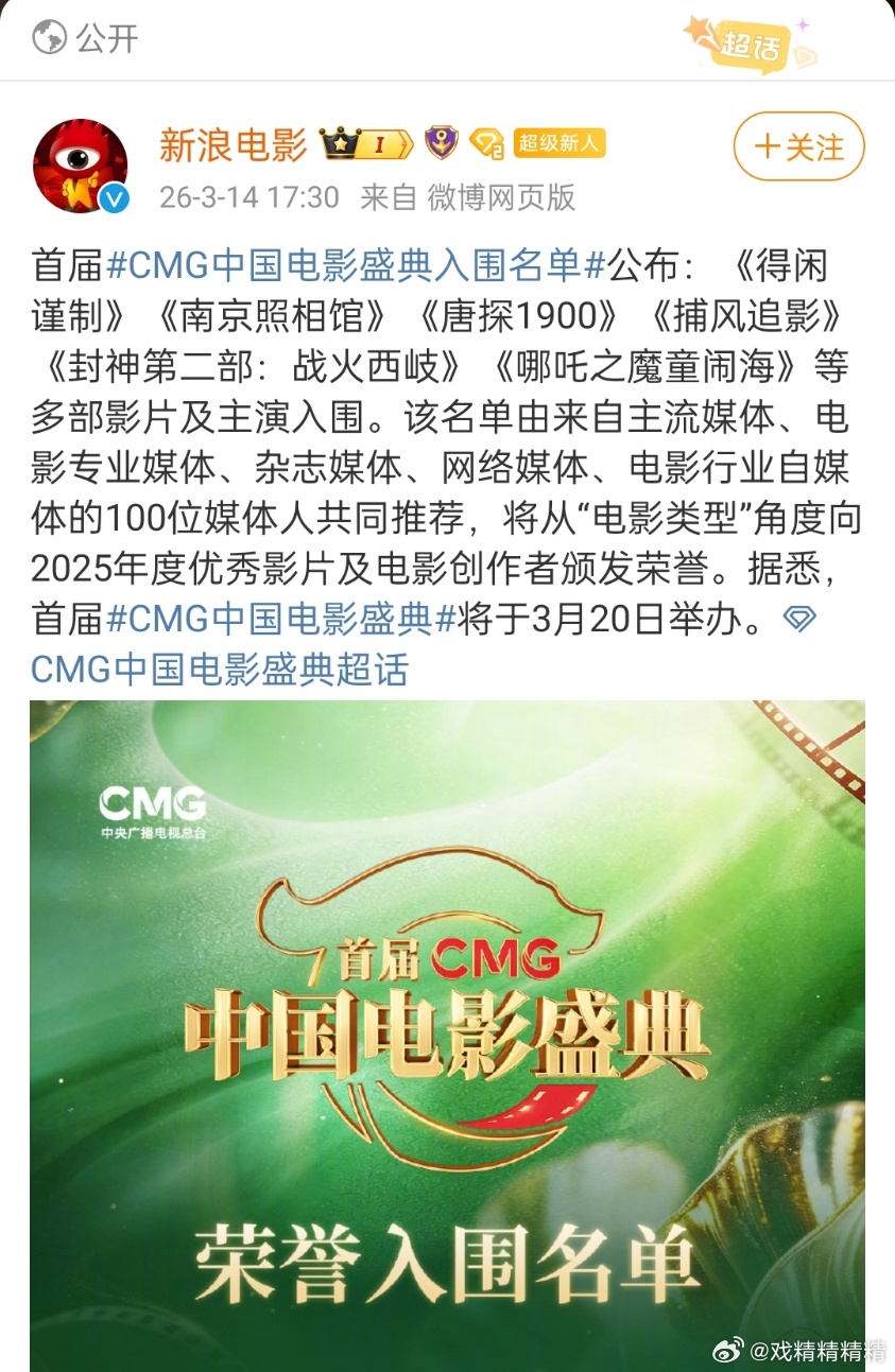 首届CMG中国盛典电影入围得闲谨制、南京照相馆、封神2、哪吒2、唐探1990等……网传参加的嘉宾有成龙,肖战,大鹏,邓超,辛芷蕾,沈腾,刘昊然,杨幂,张子枫,吴京,梁家辉,于适、王安宇,黄渤,丁程鑫,董子健,易烊千玺。