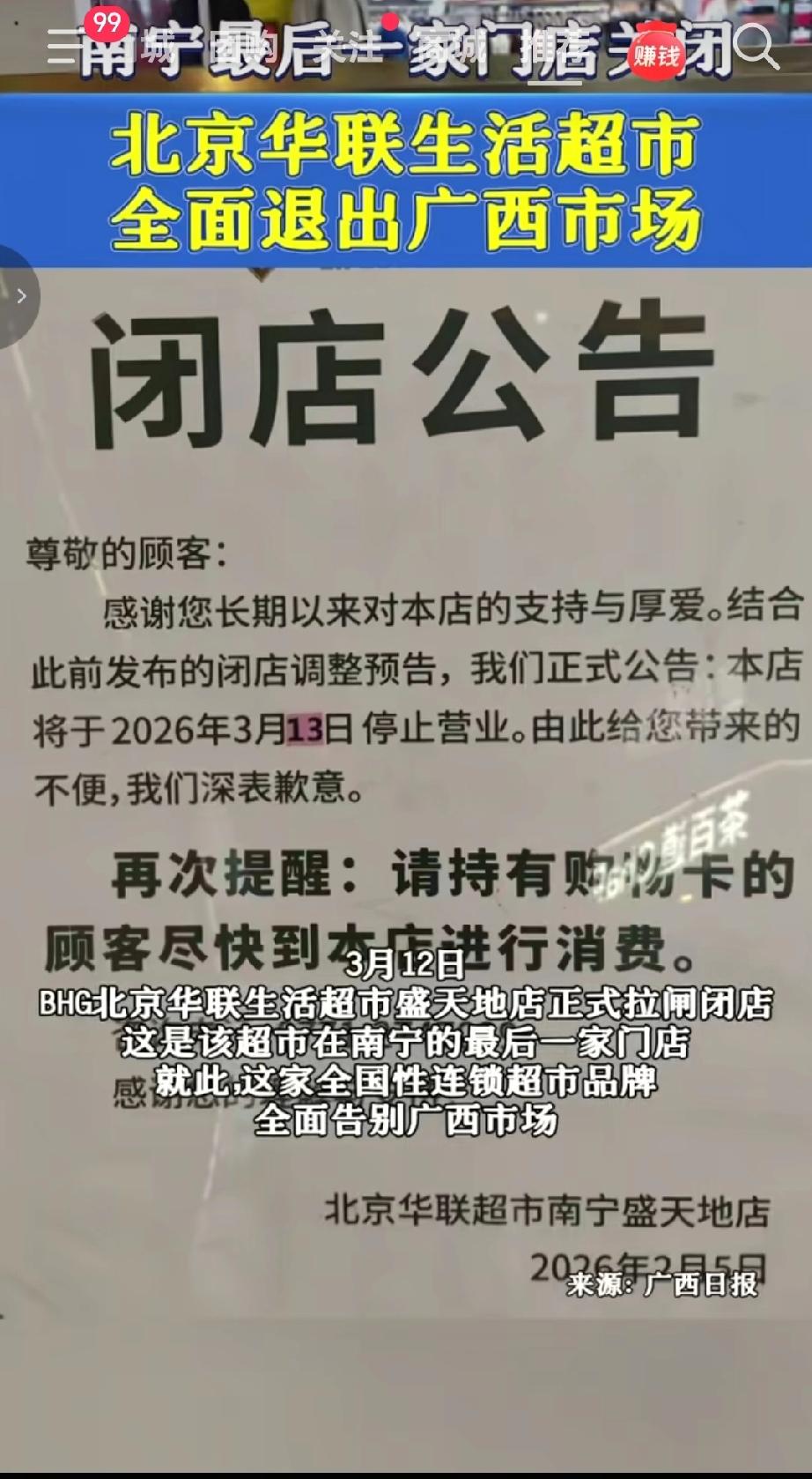 3月12日,北京华联生活超市南宁最后一家门店关闭,标志着该品牌正式退出南宁市场。 若持有北京华联购物卡/储值卡,可联系品牌官方客服(通过超市原公示渠道或12315平台查询)办理退款,在南宁经营这么多年,承载了太多人的生活记忆。(来源于@新闻夜班)