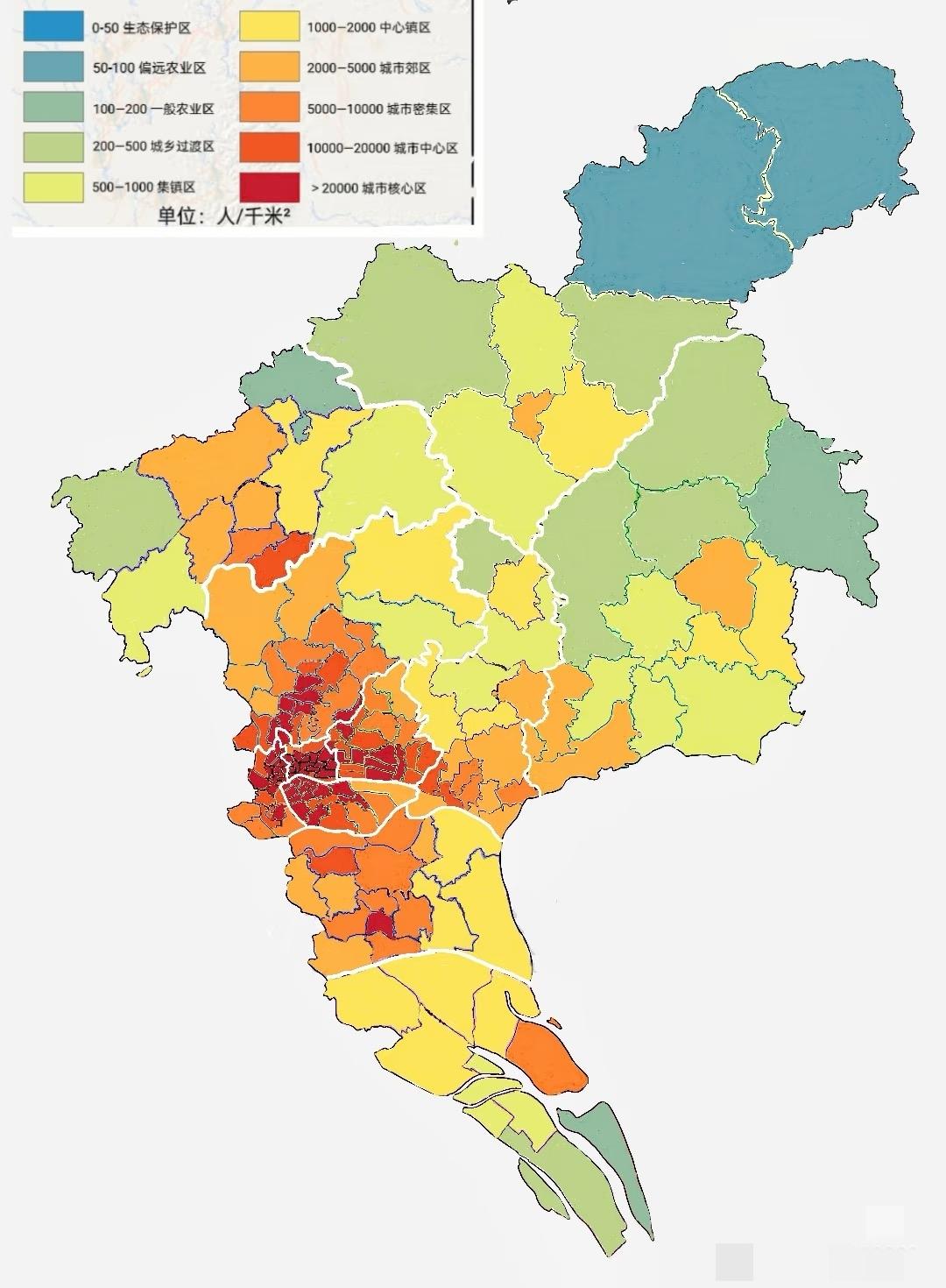 广州市人口密度分布图 直观上看,广州的人口高度集中在老四区,而且呈现出比较明显的从中心城区到郊区的多种密度层次。