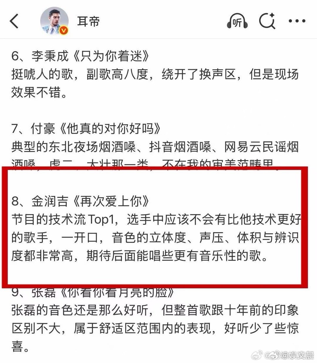 耳帝说金润吉是魔力歌里技术Top1他那个声压太强了,一开口全场都安静,那种被声