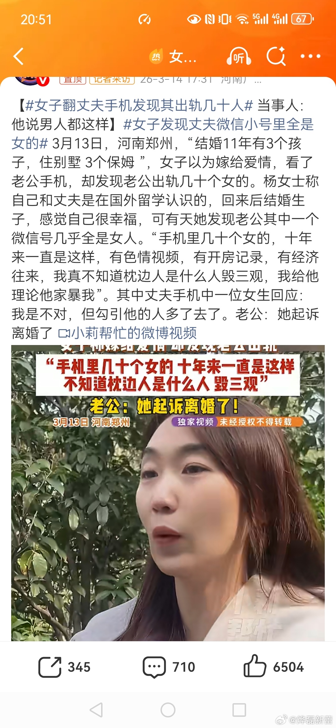 【女子翻丈夫手机发现其出轨几十人女子发现丈夫微信小号里全是女的 这不至于非要离婚吧,男的只要知错能改,就要给他机会。而且而且人生难得糊涂,这个女的能保证离婚了,还能找到下一个男的比这个男的强吧,别动不动就离婚,而且结婚10年多了,肯定有孩子了,有了孩子,一切就要为了孩子。离婚的家庭对孩子成长也不利,伤害最大的也是孩子。