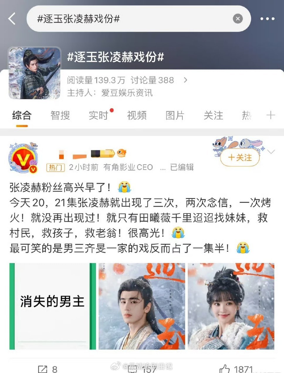 张凌赫逐玉戏份太少上热搜了